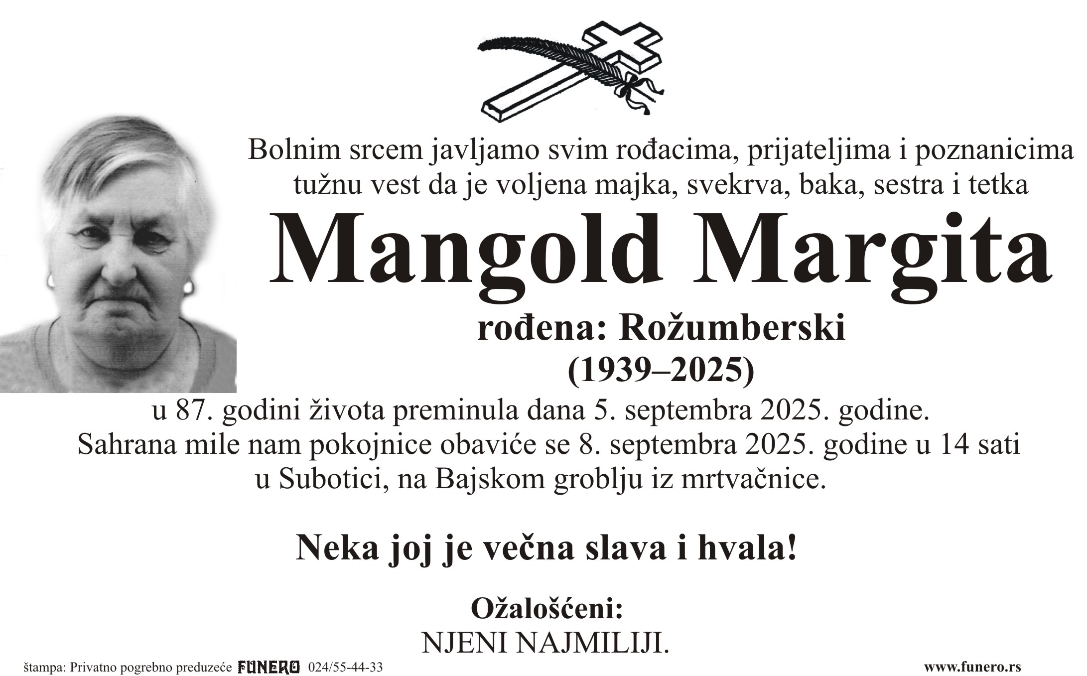 U 86. godini preminula je Margita Mangold iz Subotice, iz ulice Nila Armstronga. Sahrana je 8. septembra u 14 sati na Bajskom groblju iz mrtvačnice.