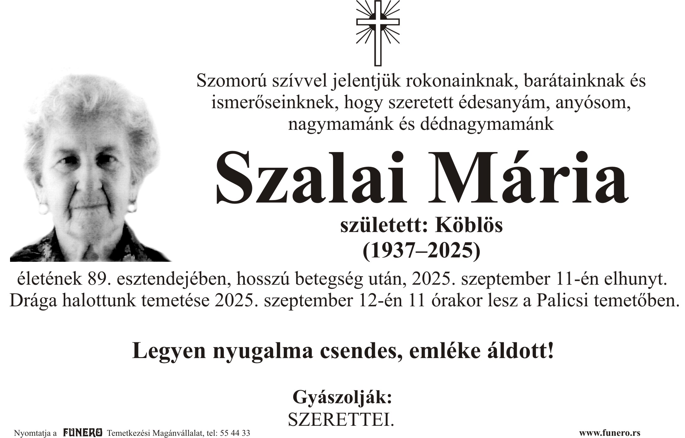 U 88. godini preminula je Maria Salai iz Subotice, iz Avalske ulice. Sahrana je 12. septembra u 11 sati na Palićkom groblju.