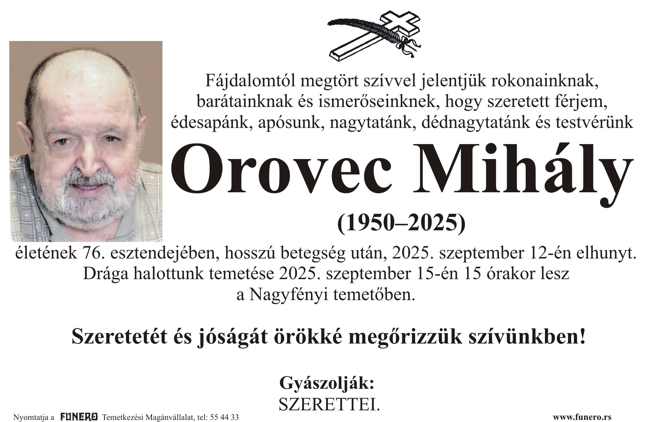 U 75. godini preminuo je Mihalj Orovec iz Starog Žednika, sa Beogradskog puta. Sahrana je 15. septembra u 15 sati na groblju u Starom Žedniku.