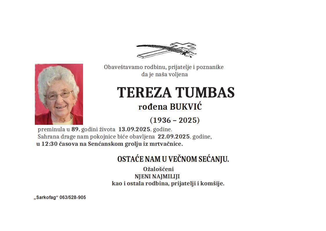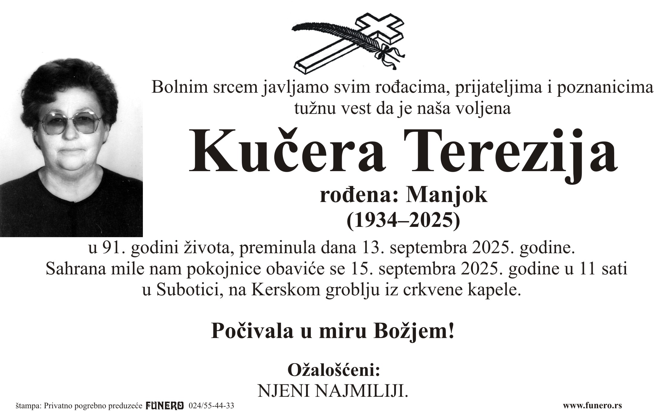U 91. godini preminula je Terezija Kučera iz Subotice, sa Beogradskog puta. Sahrana je 15. septembra u 11 sati na Kreskom groblju iz crkvene kapele.