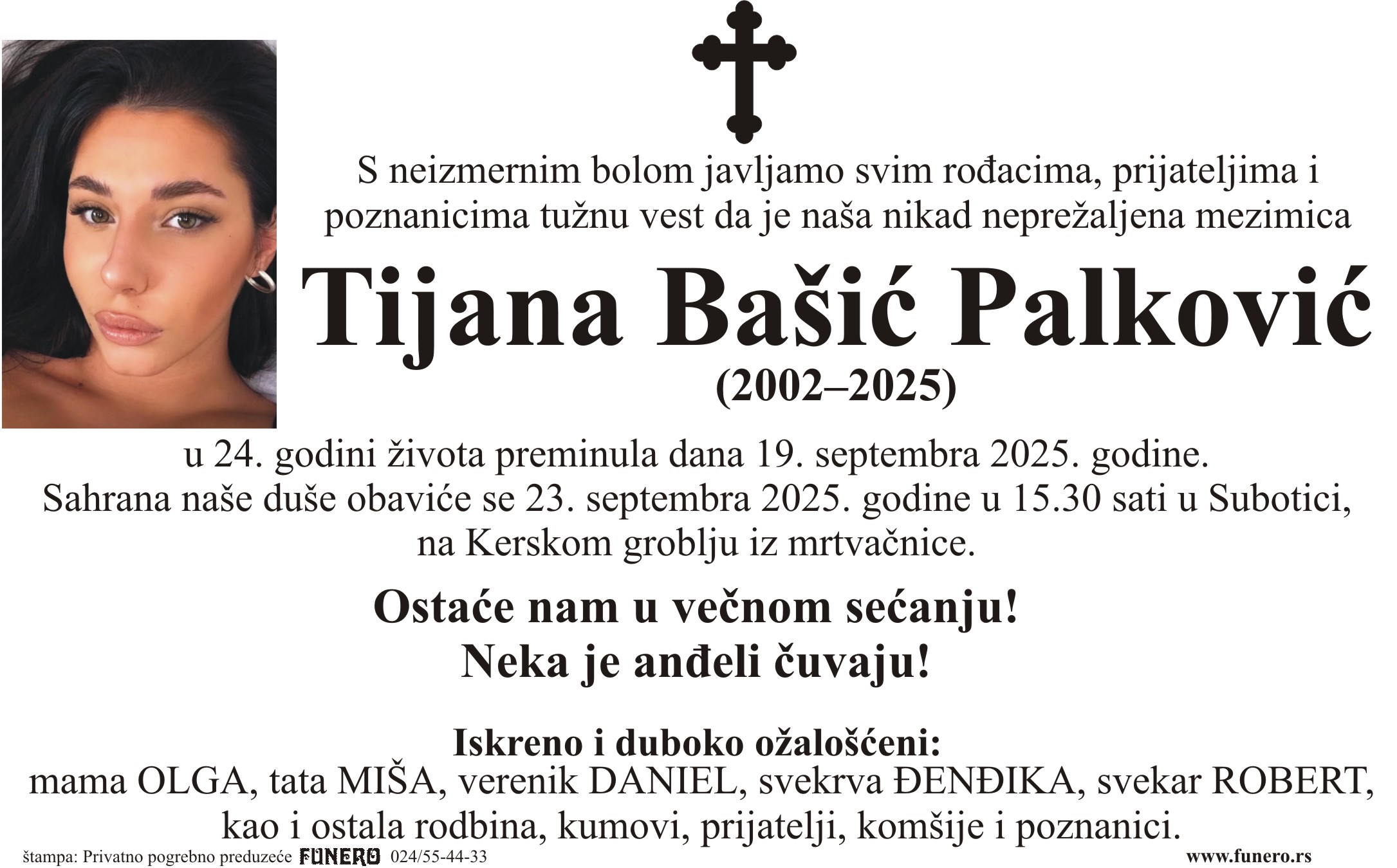 U 23. godini preminula je Tijana Bašić Palković iz Subotice, iz ulice Braće Radića. Sahrana je 23. septembra u 15 časova i 30 minuta na Kerskom groblju iz mrtvačnice.