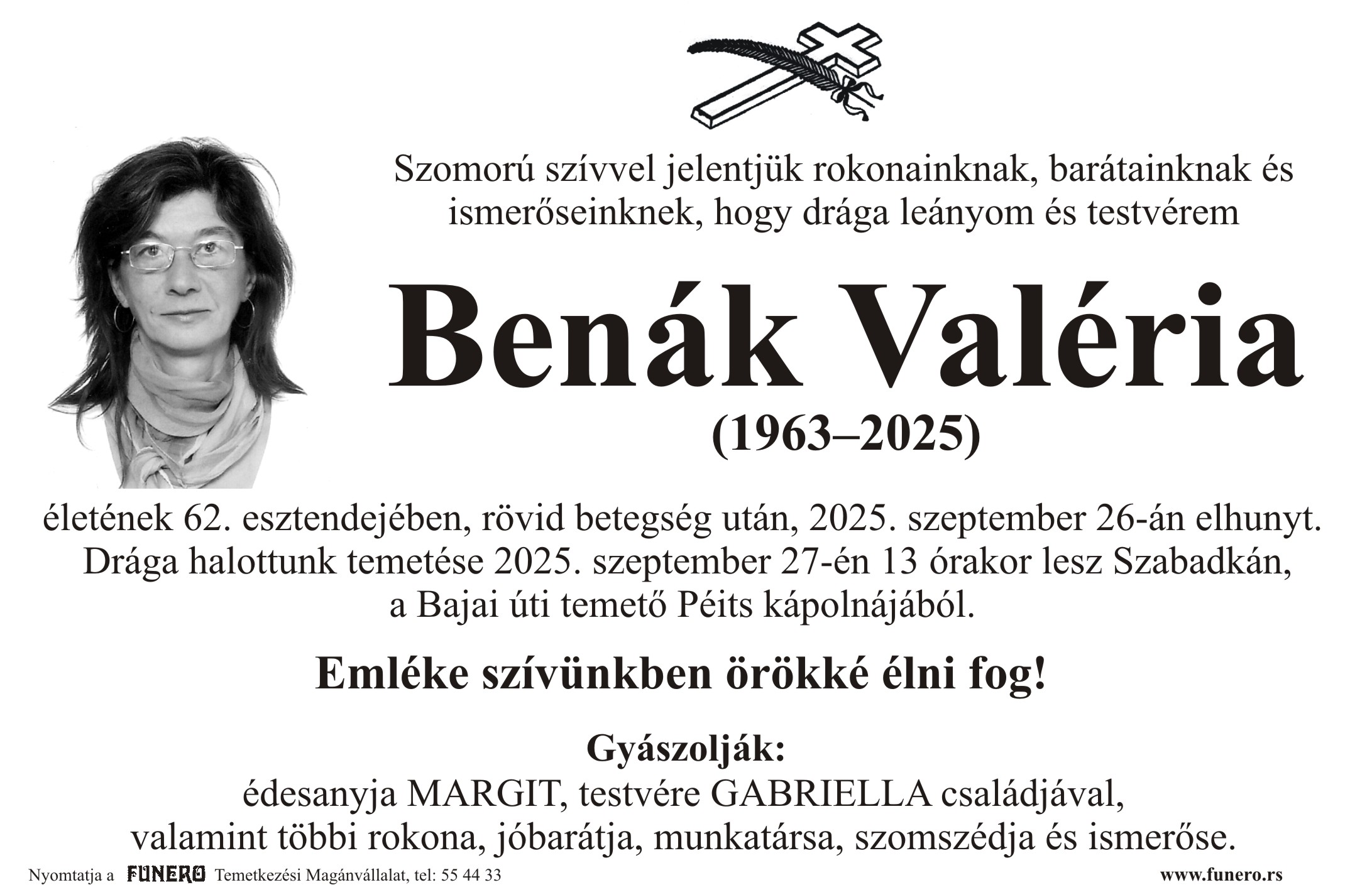 U 62. godini preminula je Valeria Benak iz Subotice, iz ulice Jovana Mikića. Sahrana je 27. septembra u 13 sati na Bajskom groblju iz Peić kapele.