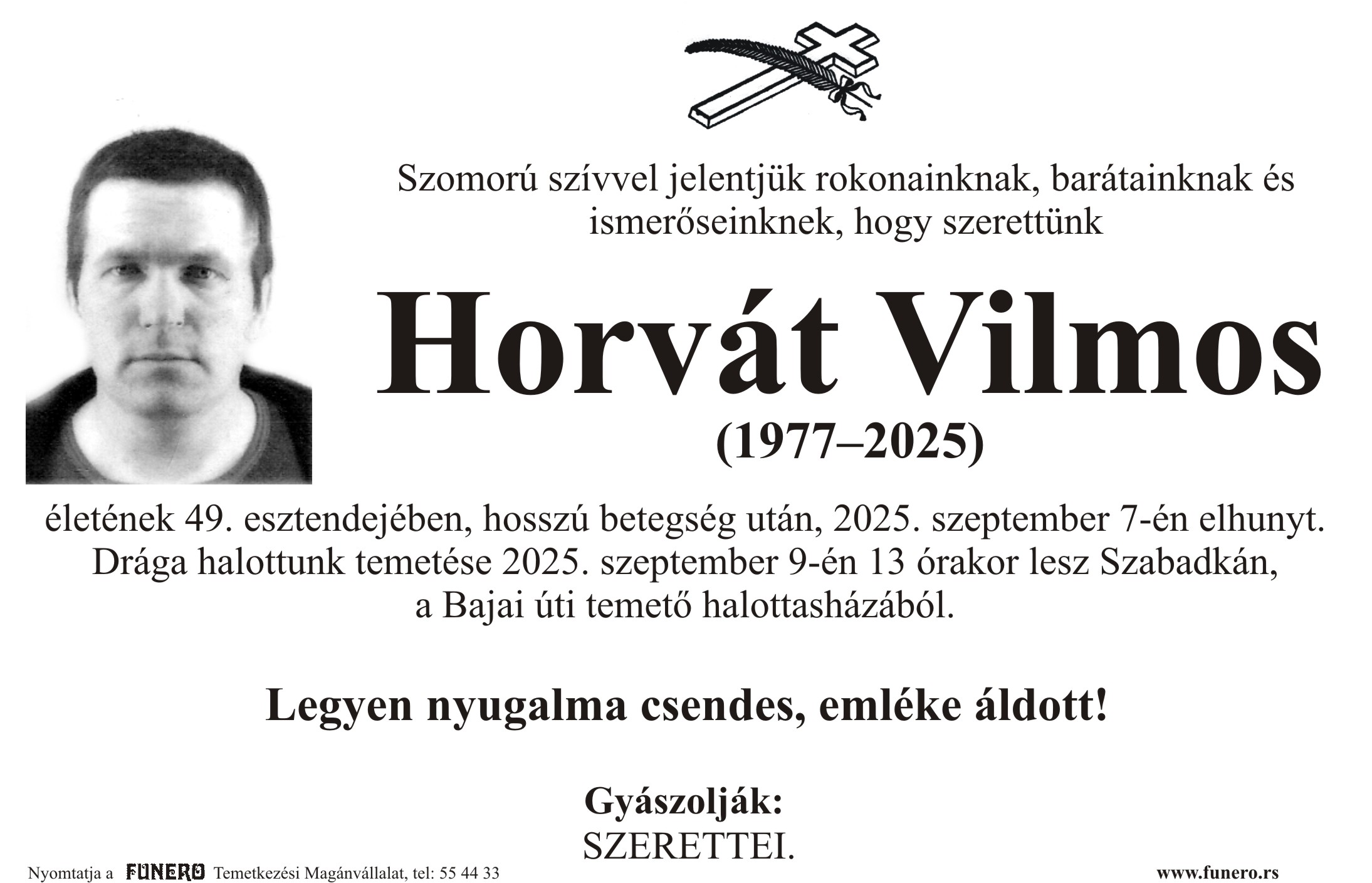 U 48. godini preminuo je Vilmoš Horvat iz Subotice, iz Sutjeske ulice. Sahrana je 9. septembra u 13 sati na Bajskom groblju iz mrtvačnice.