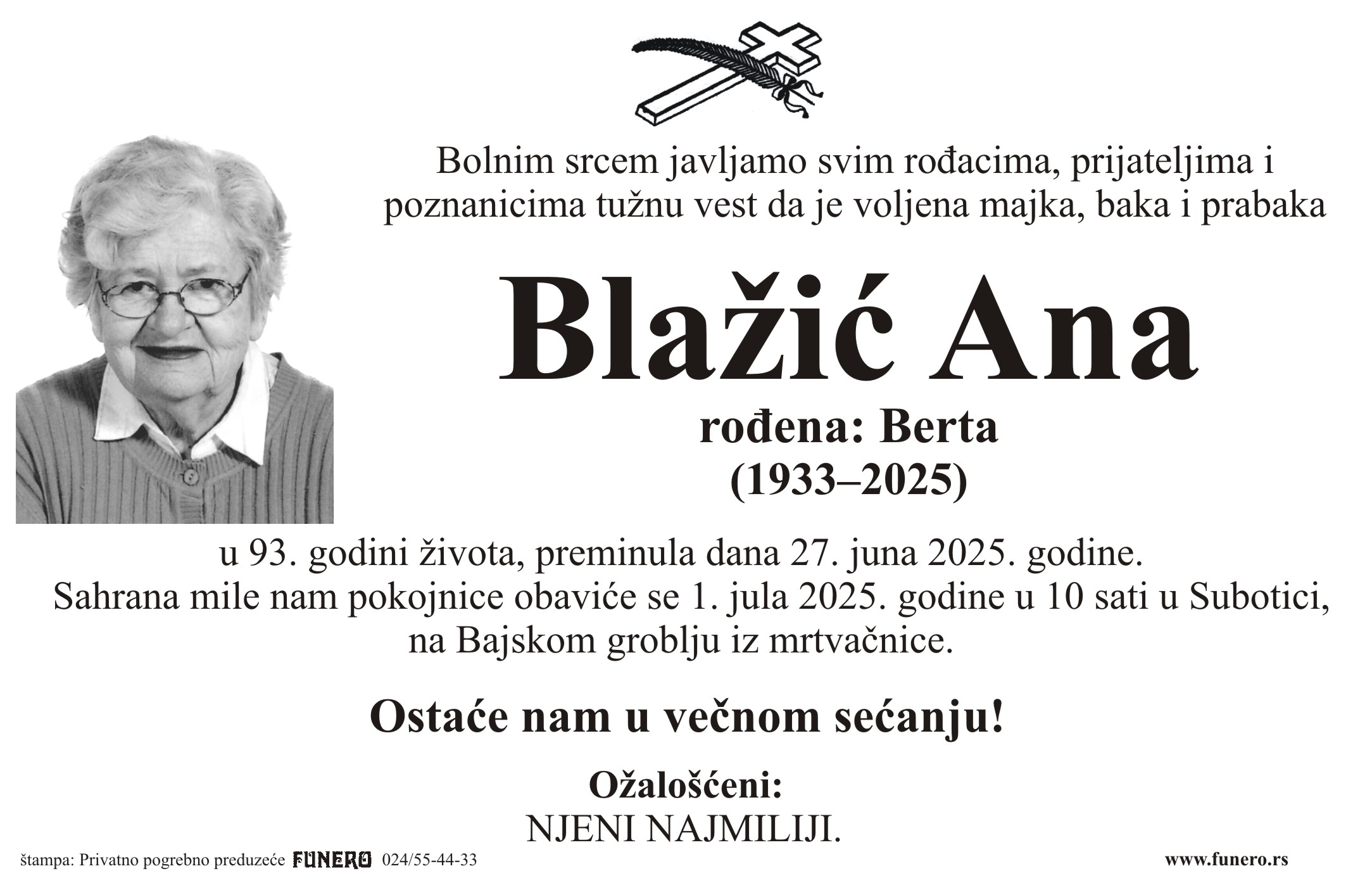 U 92. godini preminula je Ana Blažić iz Subotice, sa Trga Slobode. Sahrana je 1. jula u 10 sati na Bajskom groblju iz mrtvačnice.