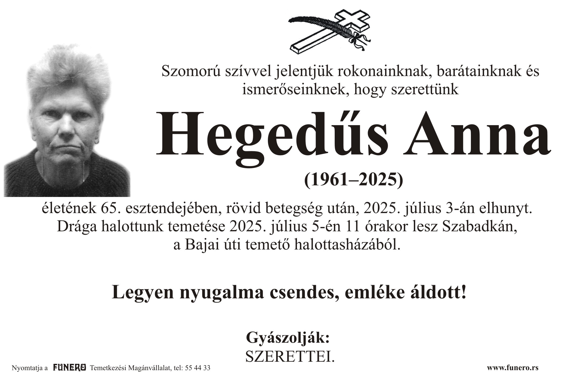 U 64. godini preminula je Ana Hegediš iz Kelebije, iz ulice Ištvana Kizura. Sahrana je 5. jula u 11 sati na Bajskom groblju iz mrtvačnice.