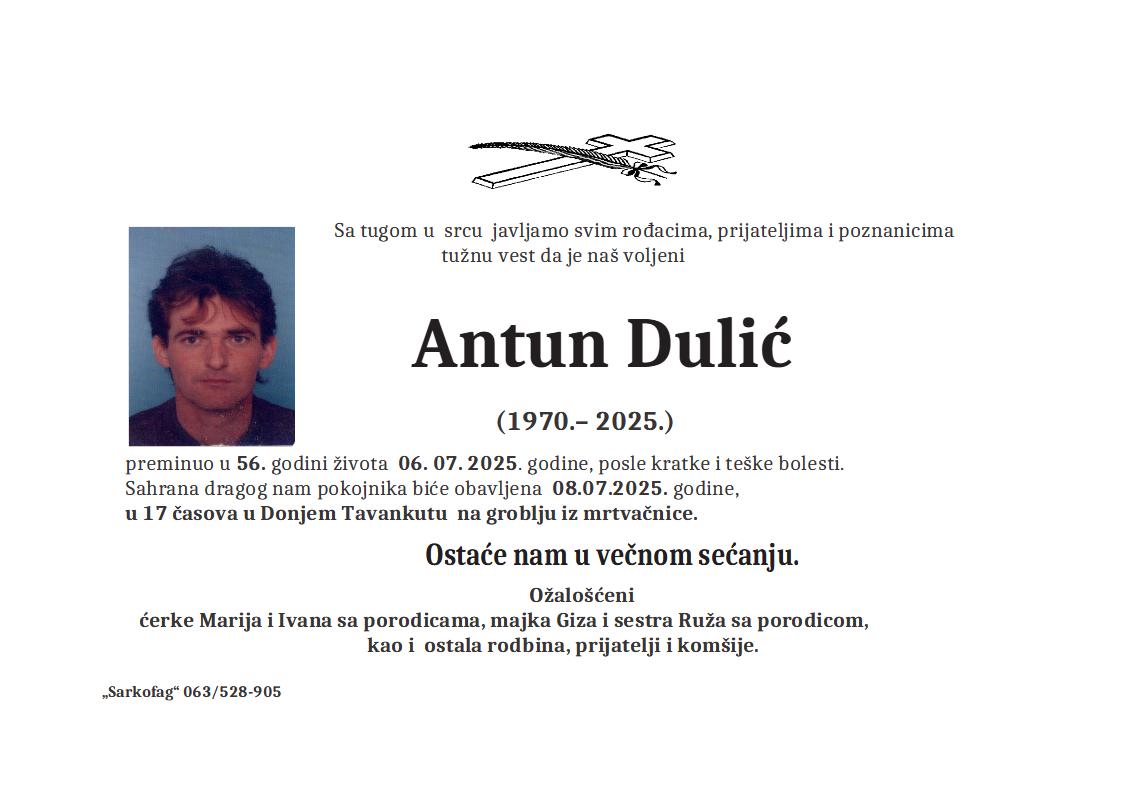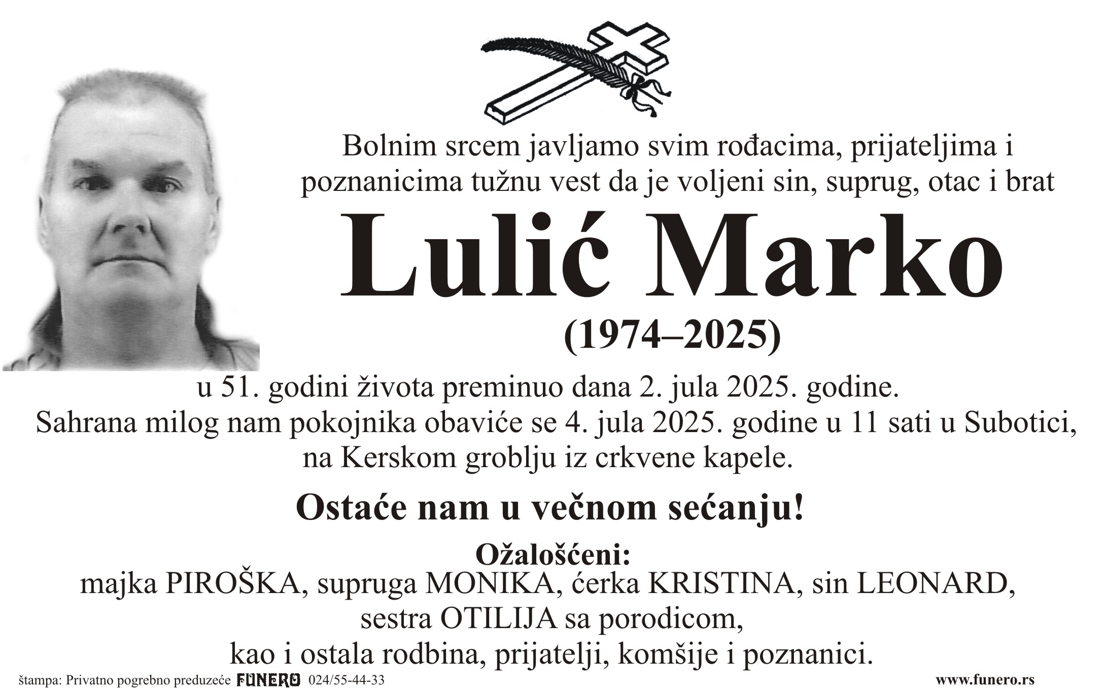 U 51. godini preminuo je Marko Lulić iz Novog Žednika. Sahrana je 4. jula u 11 sati na Kerskom groblju iz crkvene kapele.