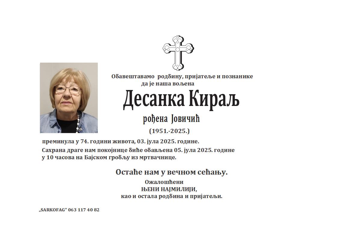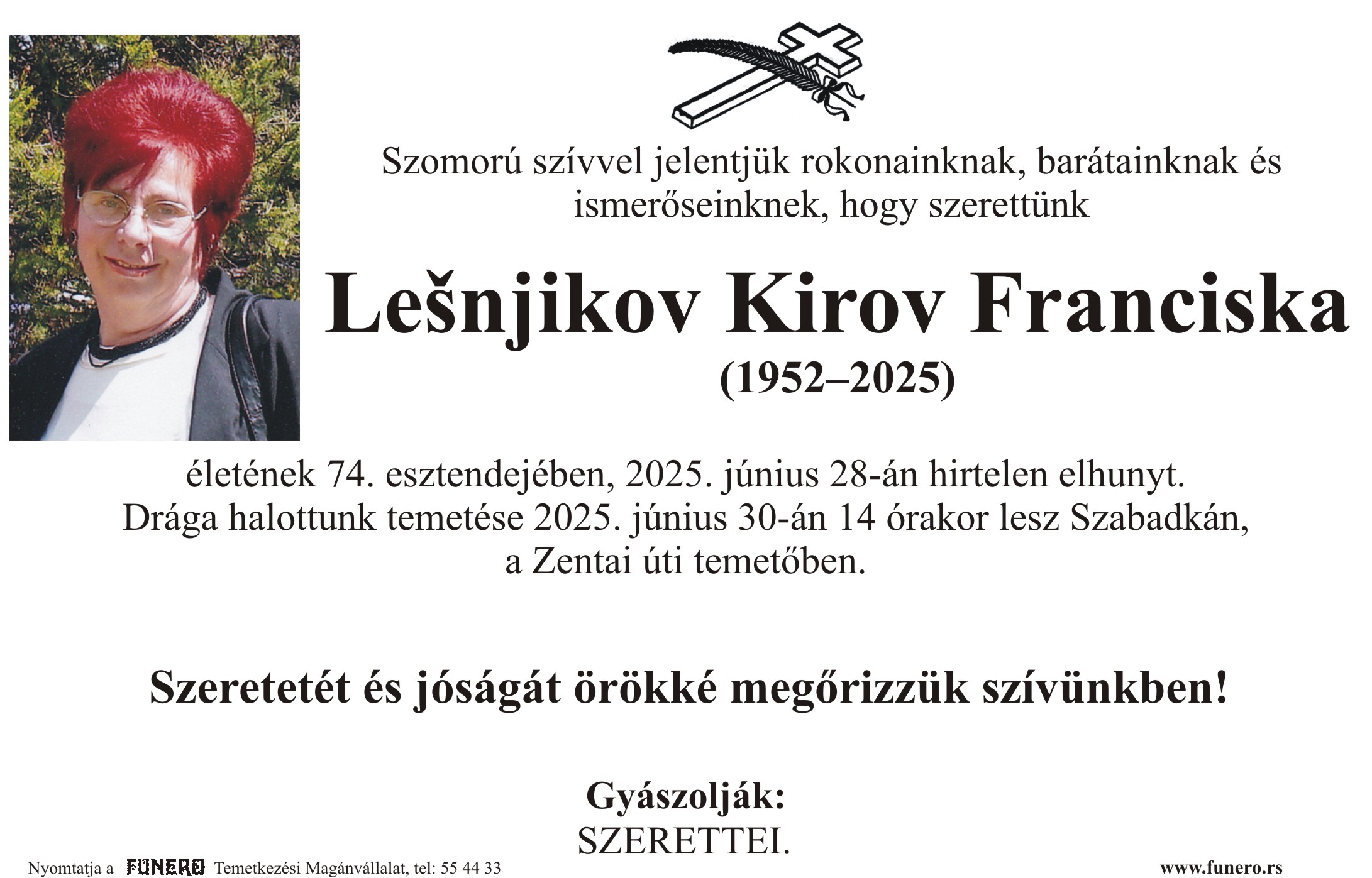 U 73. godini preminula je Franciška Lešnjikov Kirov iz Subotice, iz Sarajevske ulice. Sahrana je 30. juna u 14 sati na Senćanskom groblju.