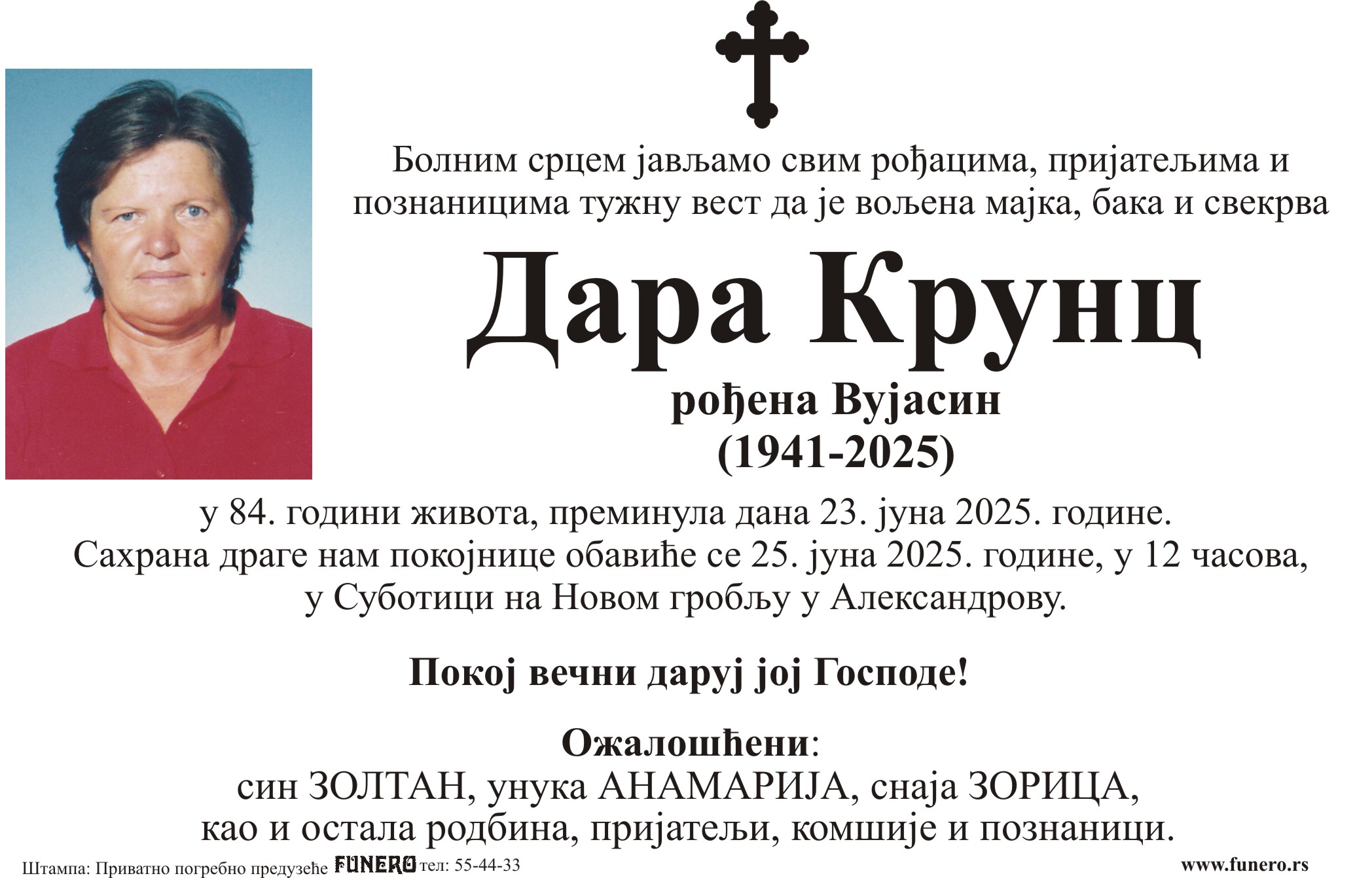 U 84. godini preminula je Draga Krunc iz Subotice, iz ulice Blaža Jovanovića. Sahrana je 25. juna u 12 časova na Novom groblju u Aleksandrovu.