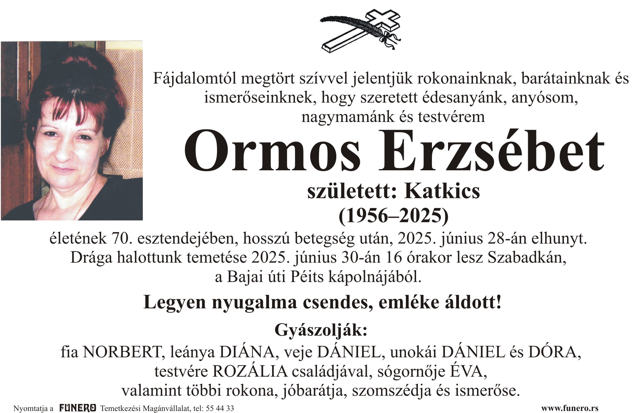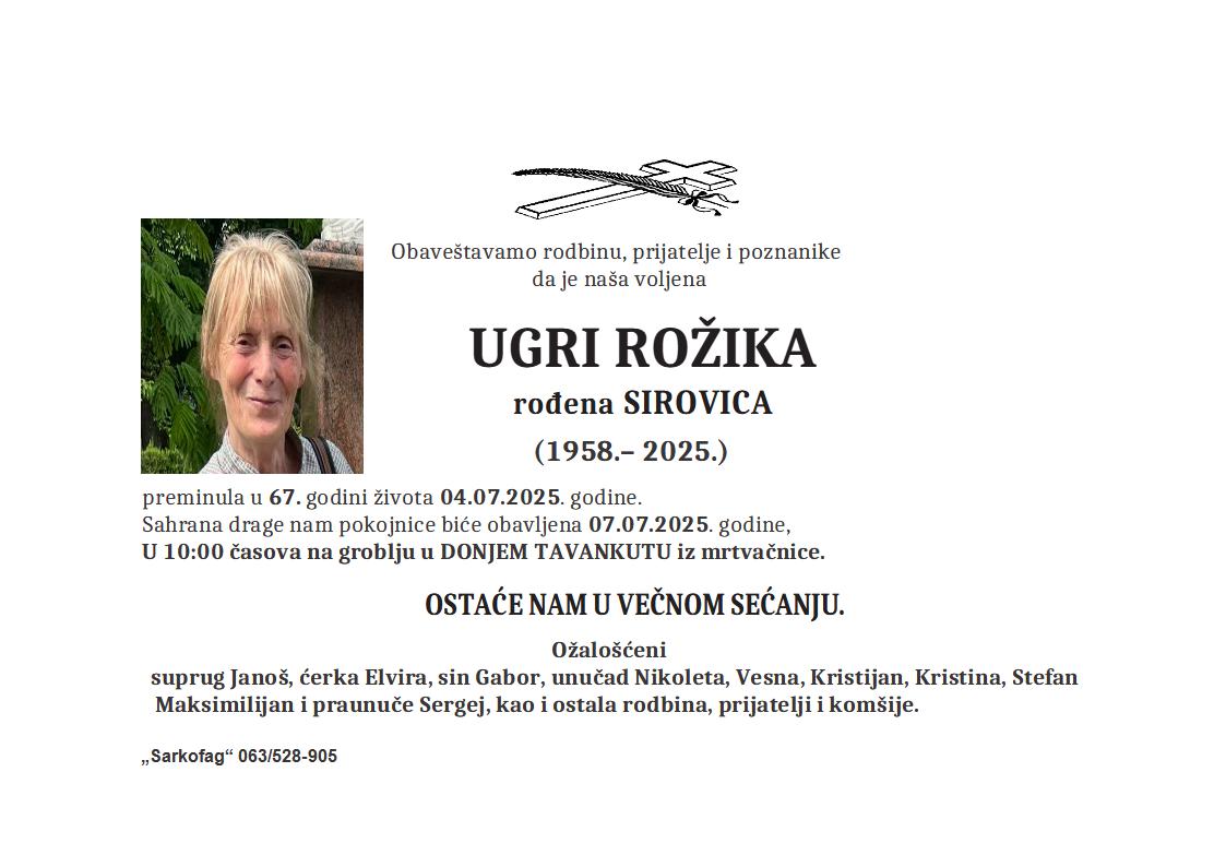 U 69. godini preminula je Eržebet Ormoš iz Subotice, iz Nikšićke ulice. Sahrana je 30. juna u 16 sati na Bajskom groblju iz Peić kapele.
