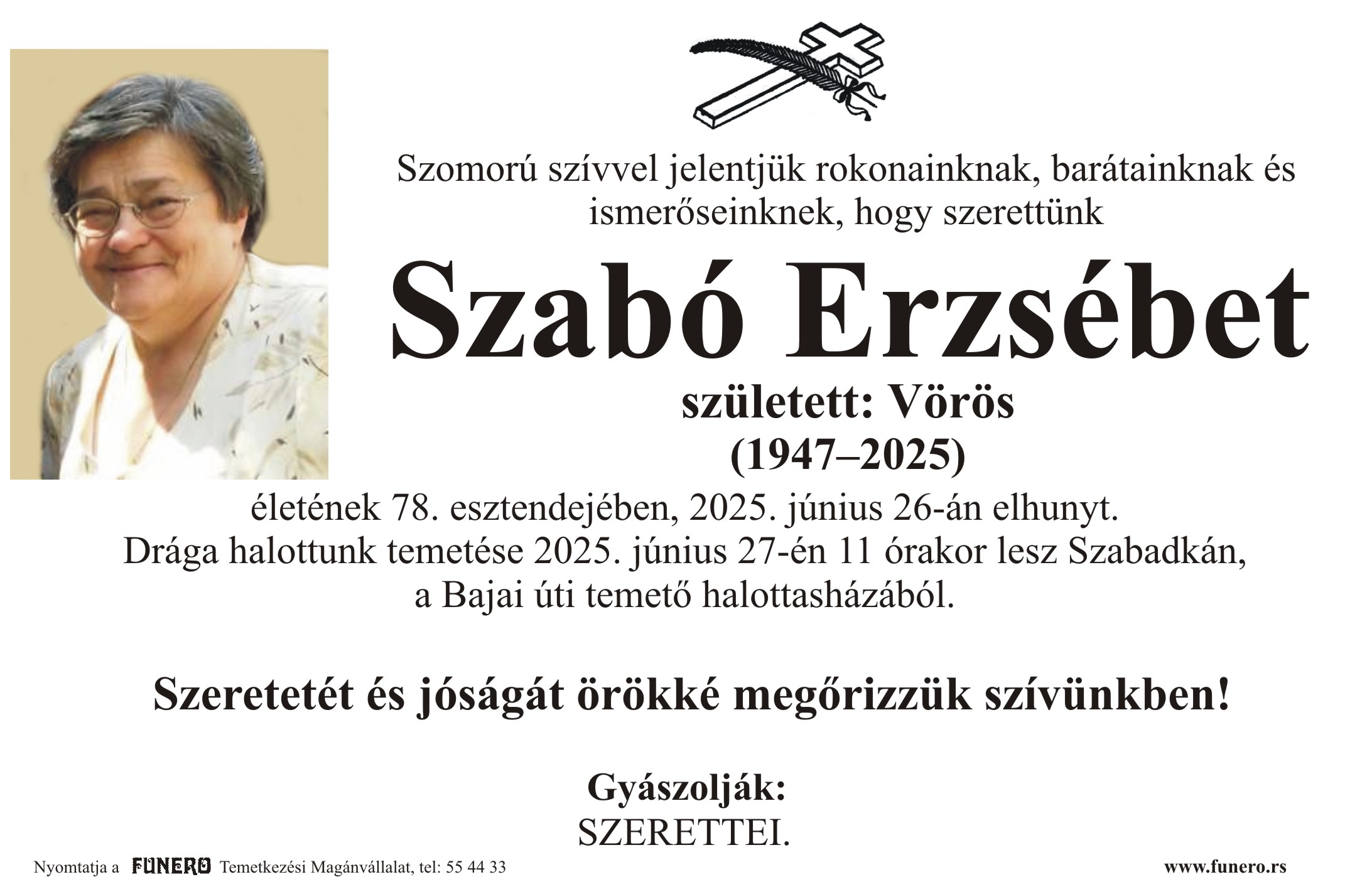 U 78. godini preminula je Eržebet Sabo iz Subotice, iz ulice Imrea Nađa. Sahrana je 27. juna u 11 sati na Bajskom groblju iz mrtvačnice.