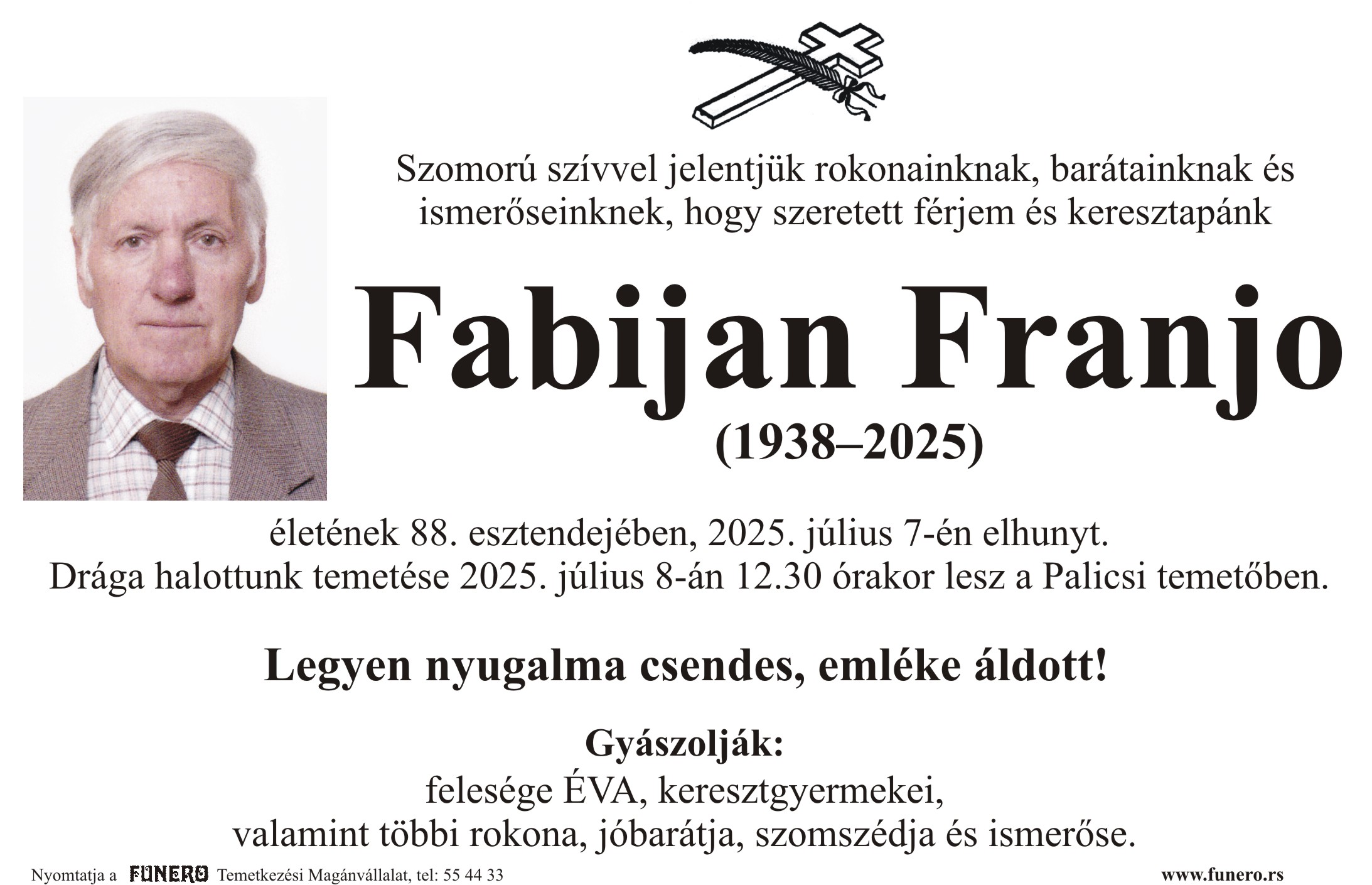 U 87. godini preminuo je Franjo Fabijan sa Palića, iz Begejske ulice. Sahrana je 8. jula u 12 sati i 30 minuta na Palićkom groblju.