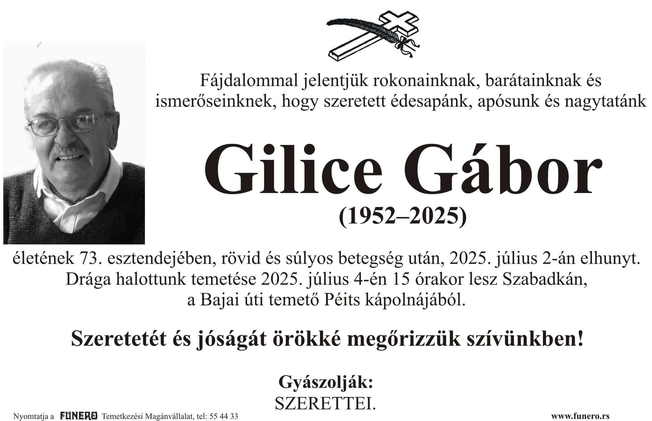 U 73. godini preminuo je Gabor Gilice iz Subotice, iz Masarikove ulice. Sahrana je 4. jula u 15 sati na Bajskom groblju iz Peić kapele.