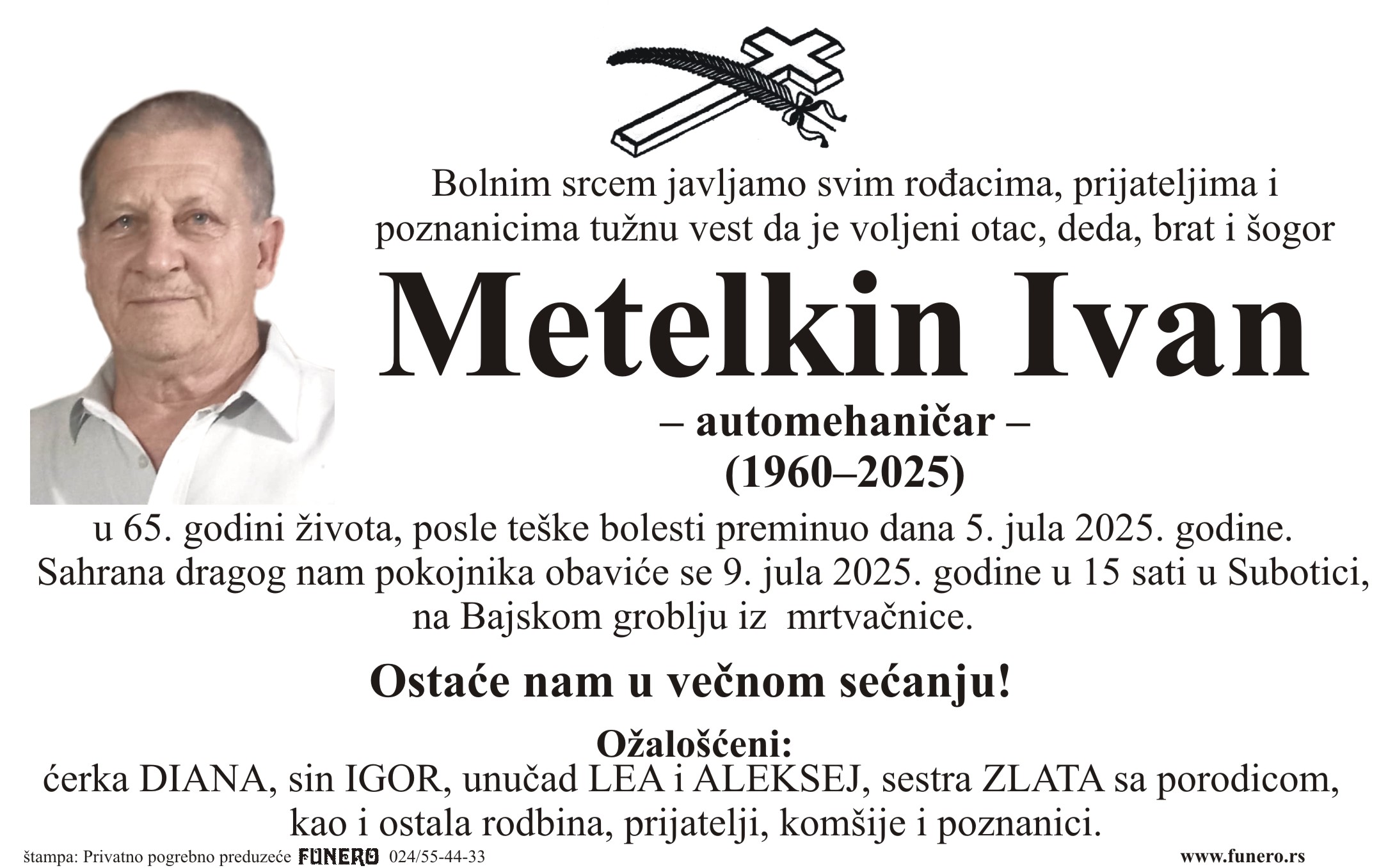 U 65. godini preminuo je Ivan Metelkin iz Kelebije, iz Graničarske ulice. Sahrana je 9. jula u 15 sati na Bajskom groblju iz mrtvačnice.