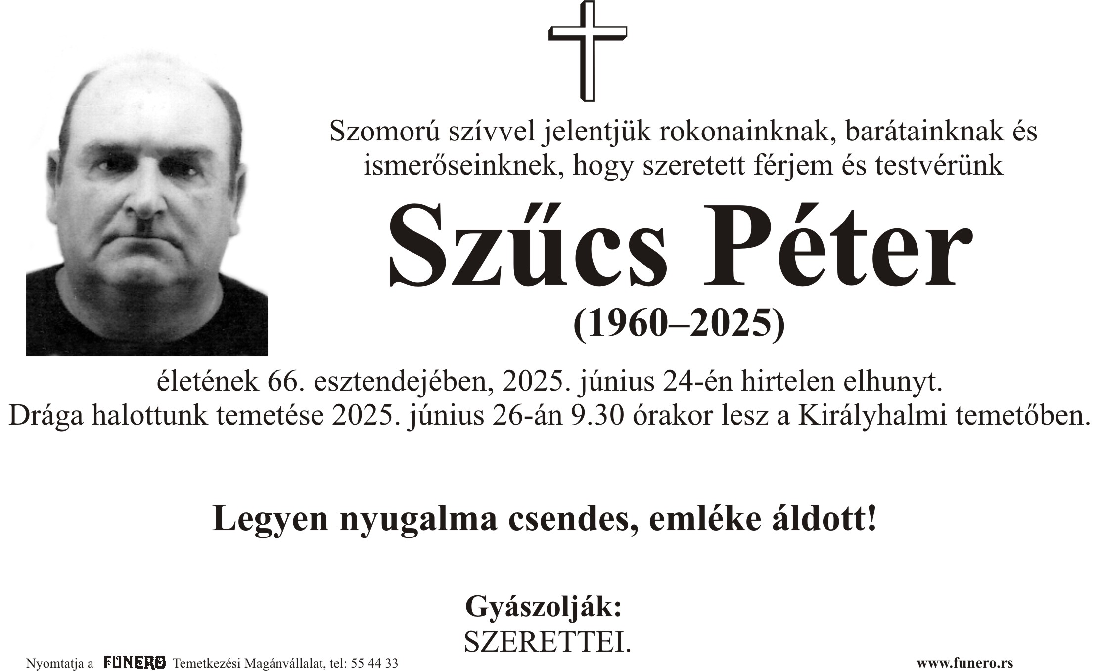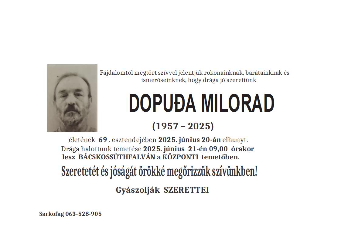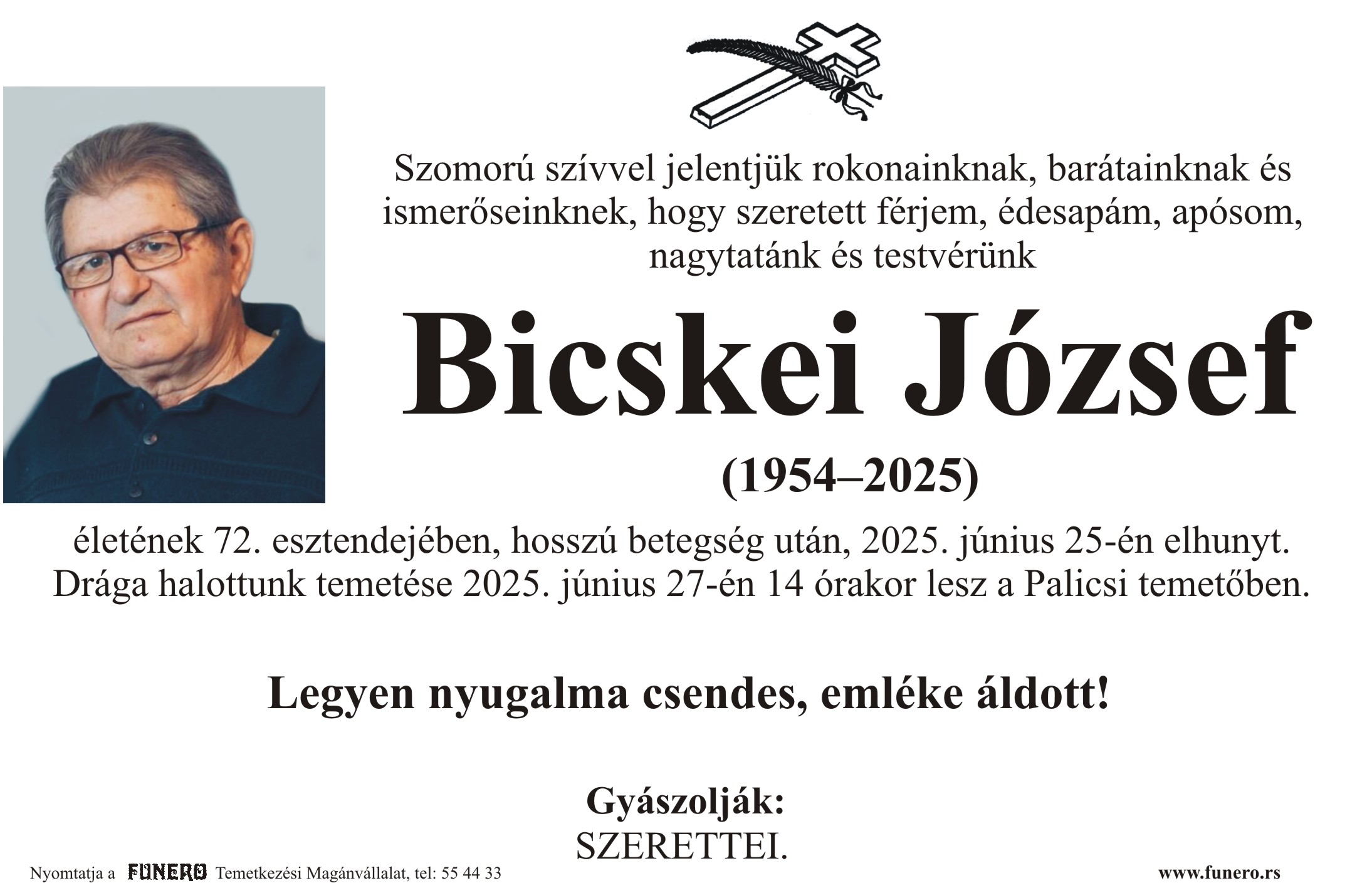 U 71. godini preminuo je Jožef Bičkei iz Hajdukova. Sahrana je 27. juna u 14 sati na Palićkom groblju.