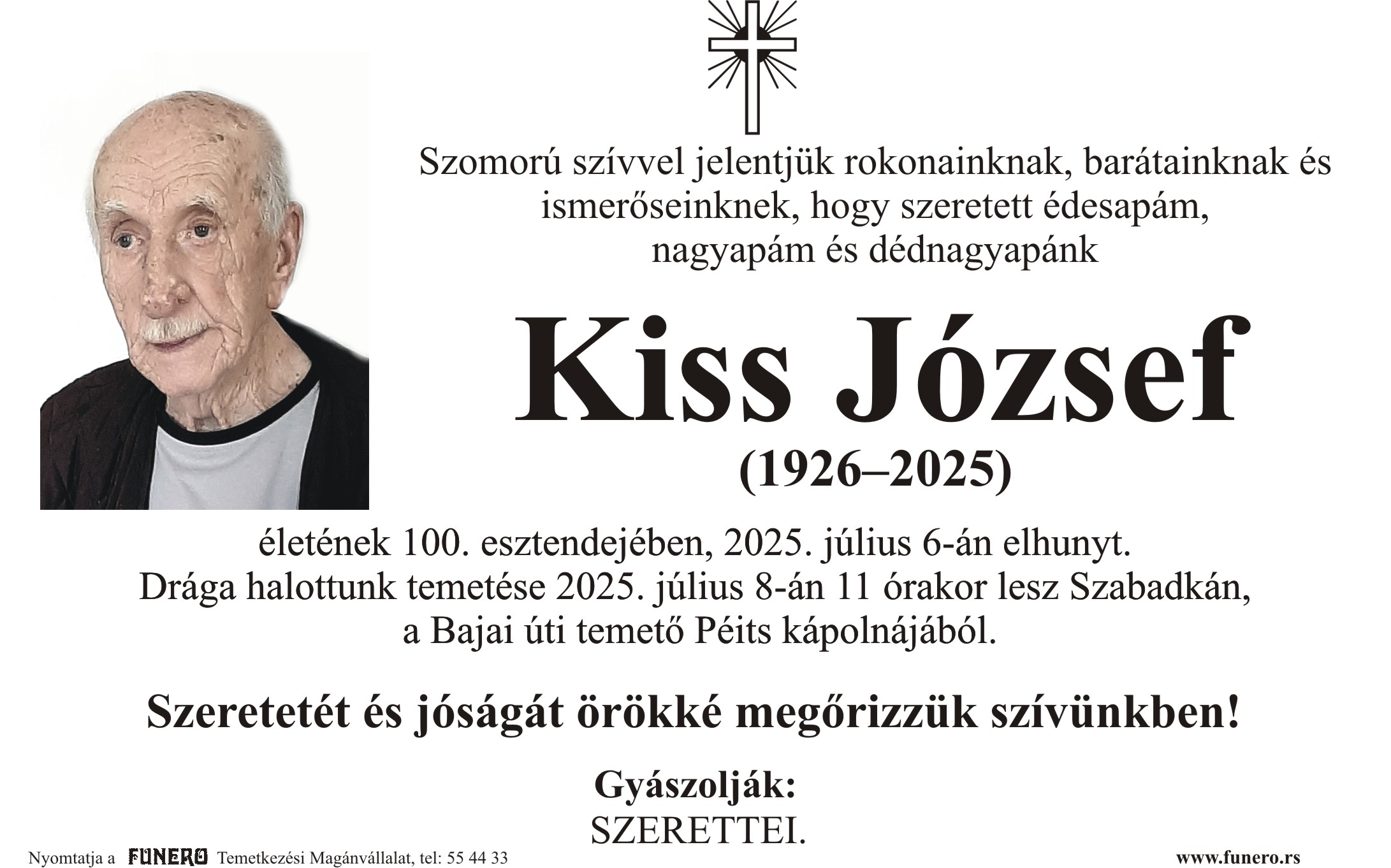 U 99. godini preminuo je Jožef Kiš iz Subotice, iz ulice Bore Stankovića. Sahrana je 8. jula u 11 sati na Bajskom groblju iz Peić kapele.