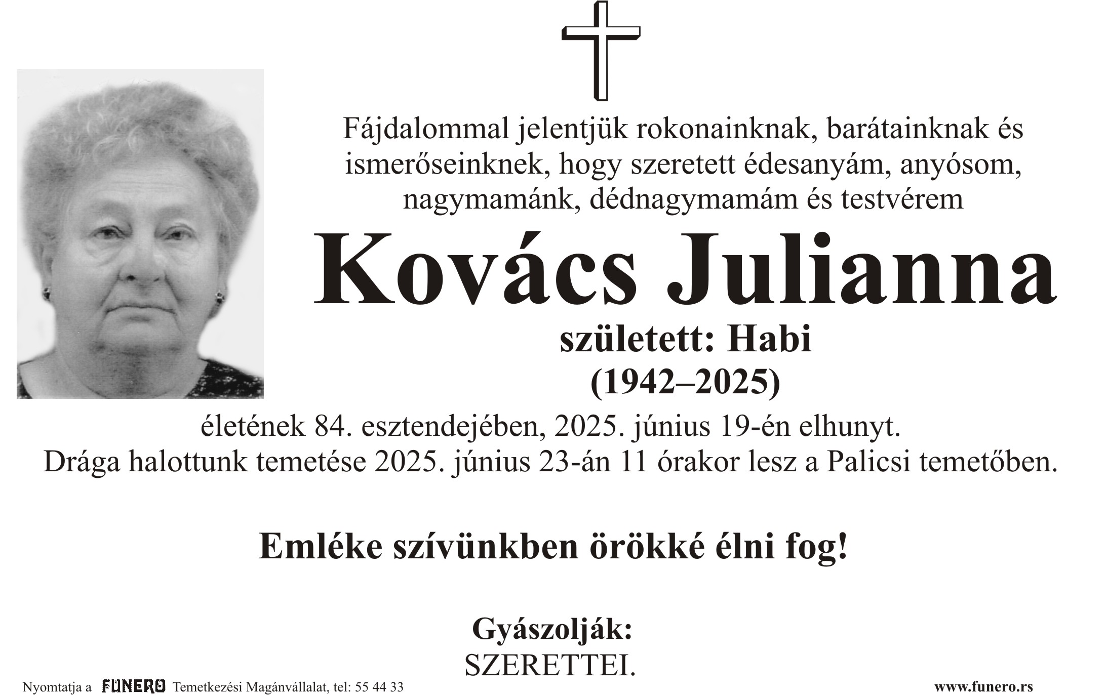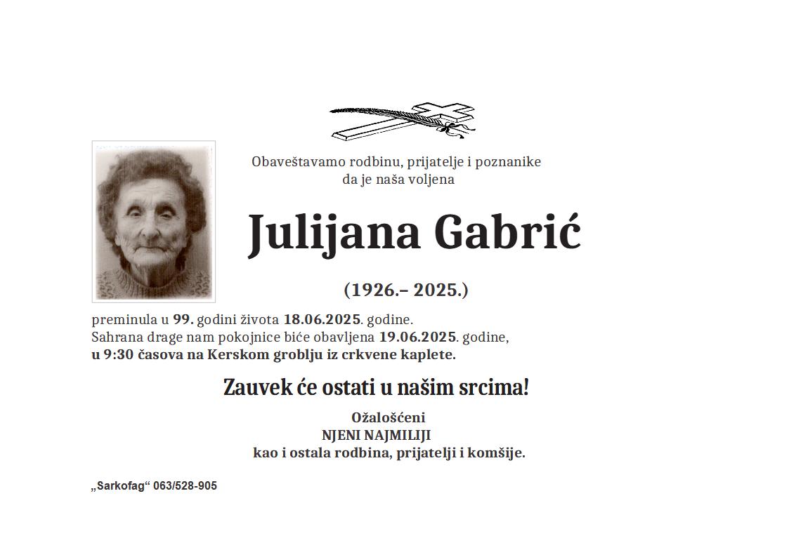 U 83. godini preminula je Juliana Kovač sa Palića, iz Dubrovačke ulice. Sahrana je 23. juna u 11 sati na Palićkom groblju.