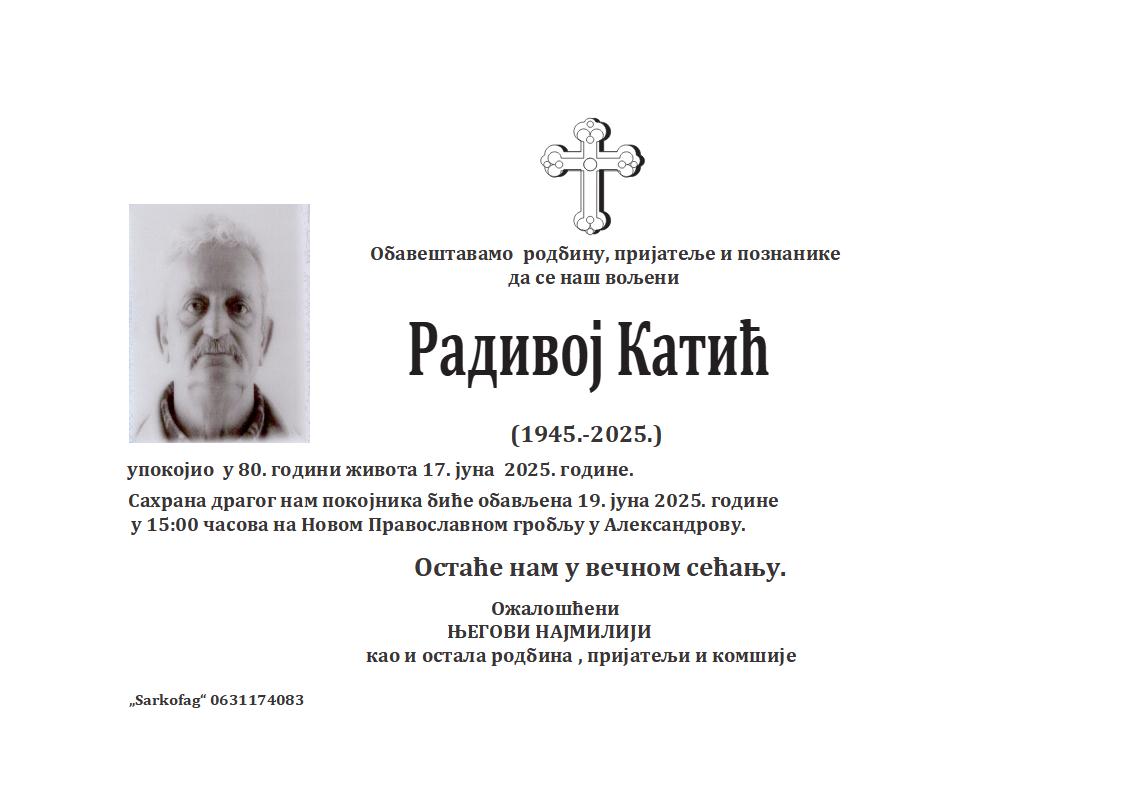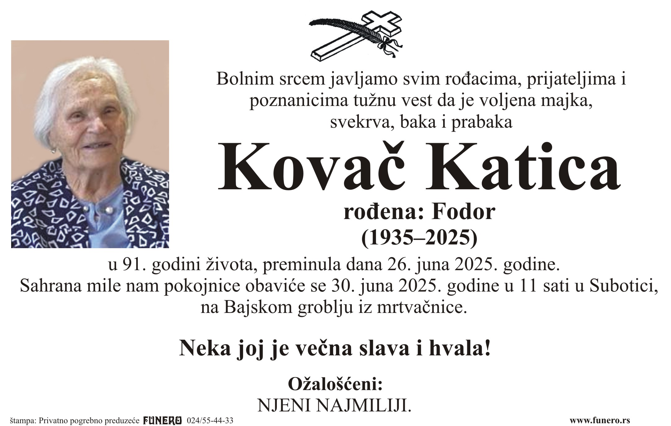 U 90. godini preminula je Katica Kovač iz Subotice, iz Požarevačke ulice. Sahrana je 30. juna u 11 sati na Bajskom groblju iz mrtvačnice.
