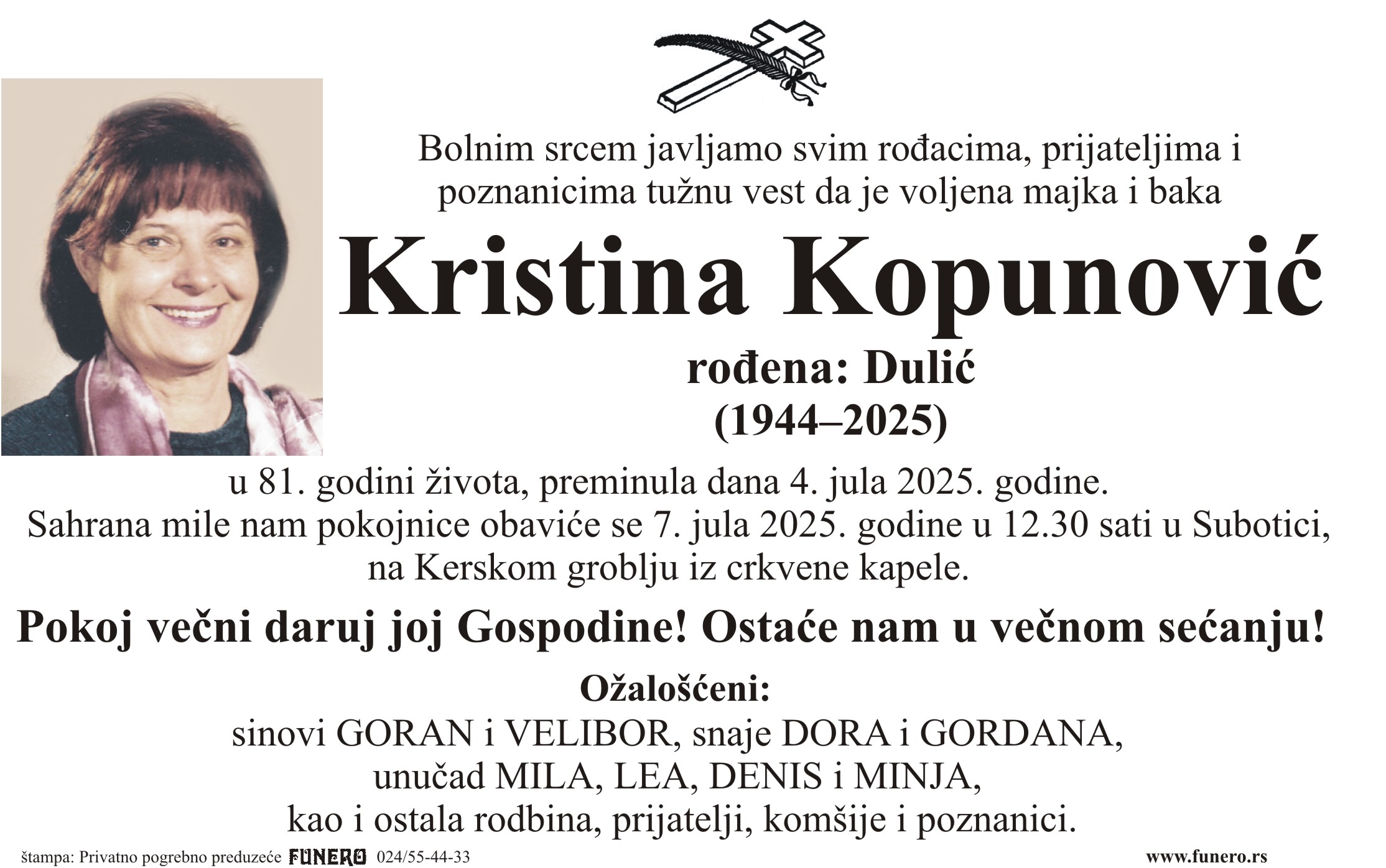 U 81. godini preminula je Kristina Kopunović iz Subotice, iz Zetske ulice. Sahrana je 7. jula u 12 sati i 30 minuta na Kerskom groblju iz crkvene kapele