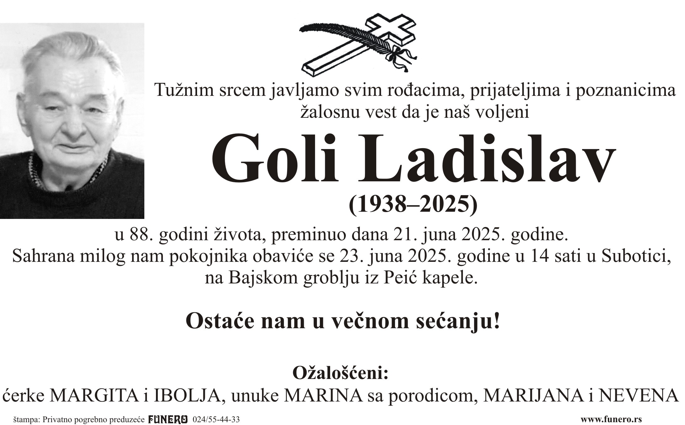 U 87. godini preminuo je Ladislav Goli iz Subotice, iz ulice Braće Milašina. Sahrana je 23. juna u 14 sati na Bajskom groblju iz Peić kapele.