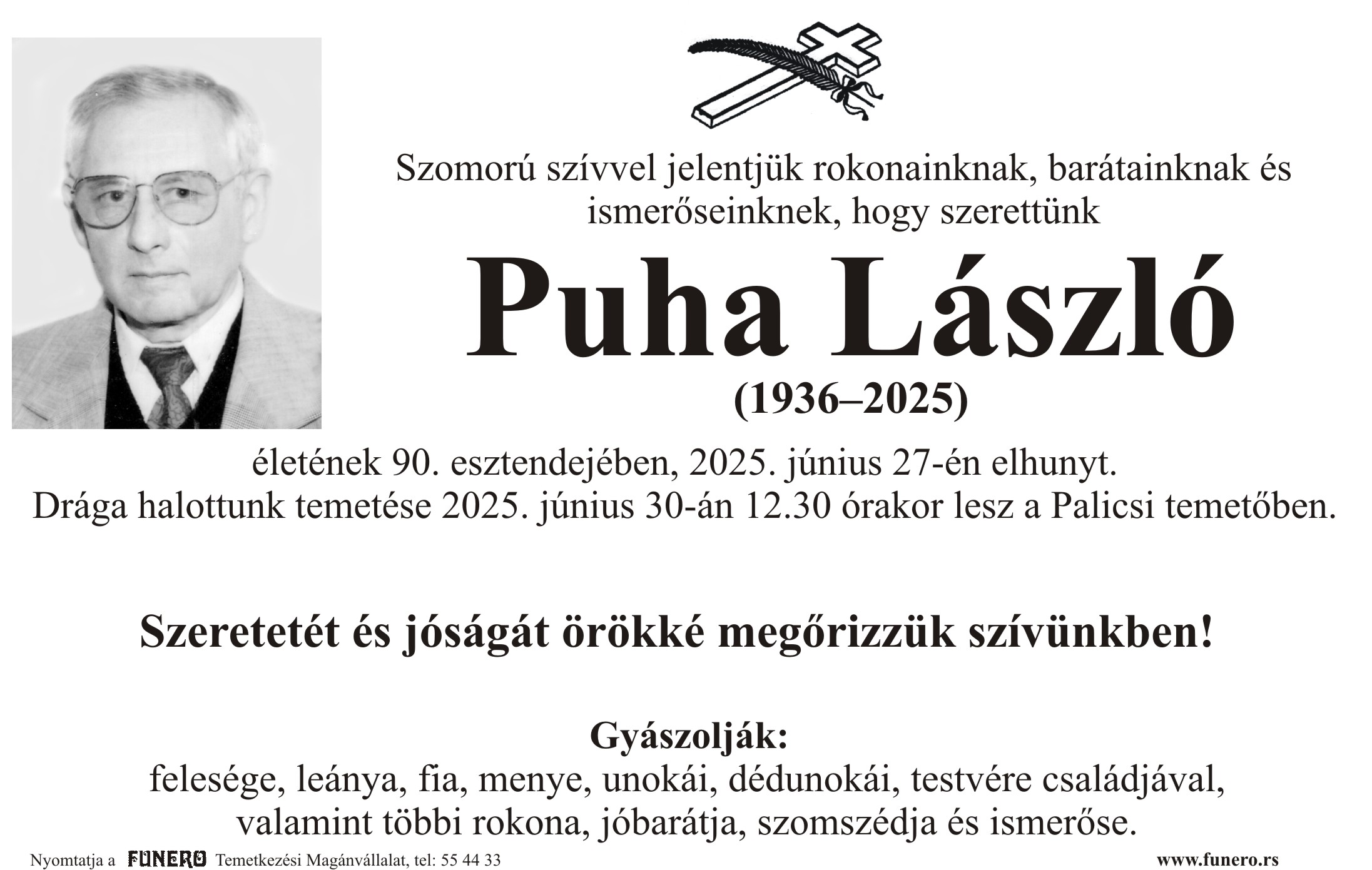 U 89. godini preminuo je Laslo Puha sa Palića, iz Javorske ulice. Sahrana je 30. juna u 12 sati i 30 minuta na Palićkom groblju.