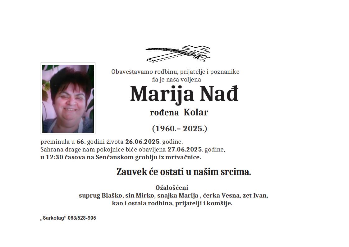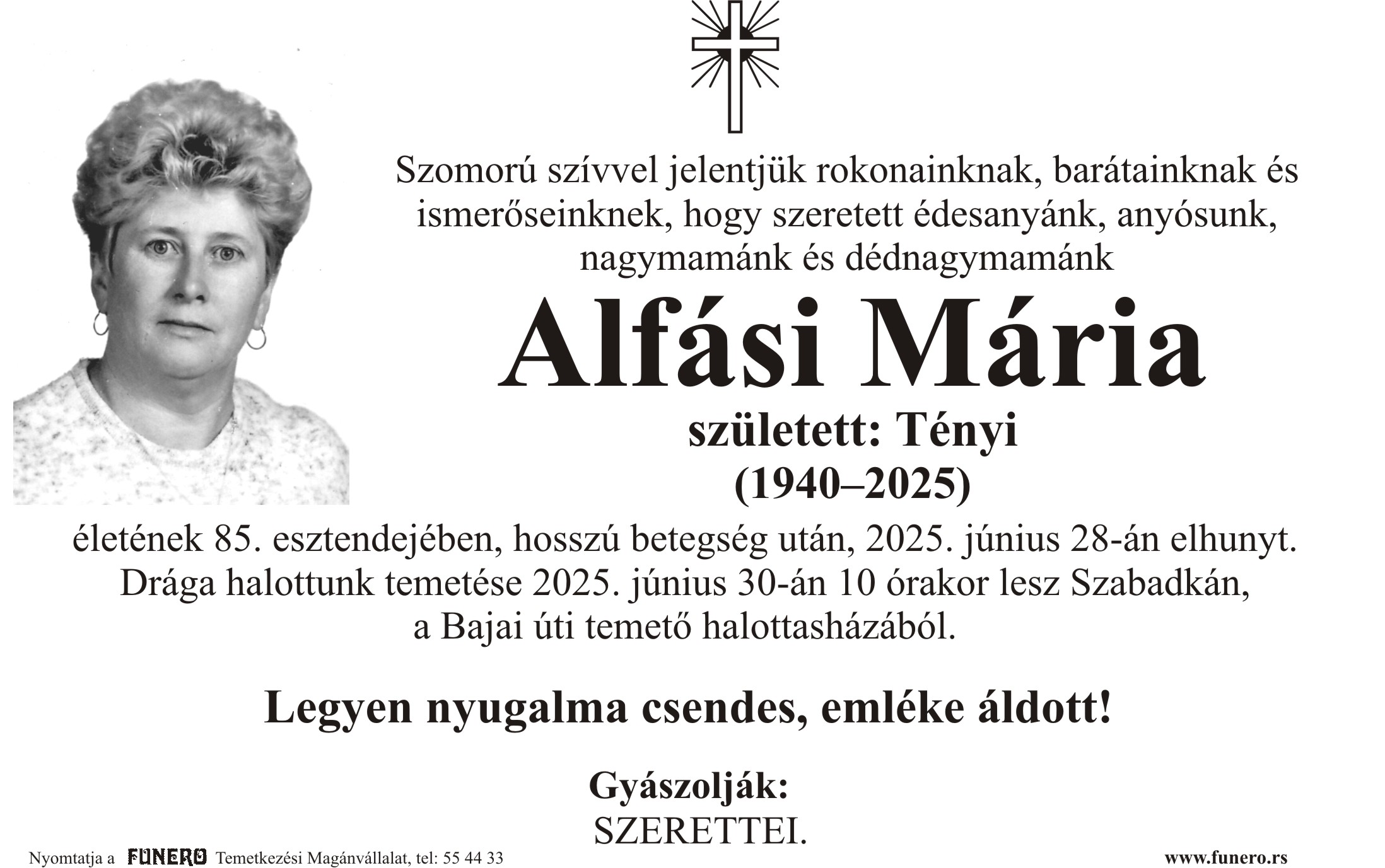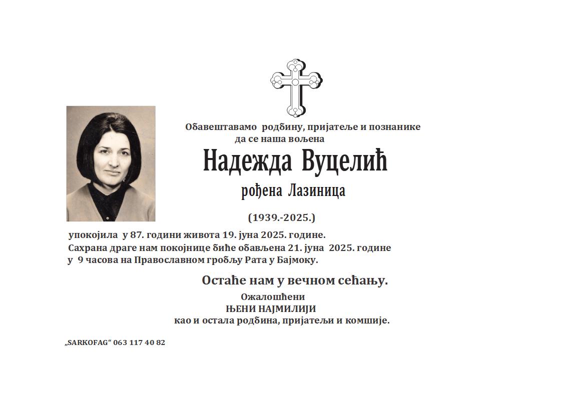 U 85. godini preminula je Marija Alfaši iz Subotice, iz ulice Borisa Krajgera. Sahrana je 30. juna u 10 sati na Bajskom groblju iz mrtvačnice.