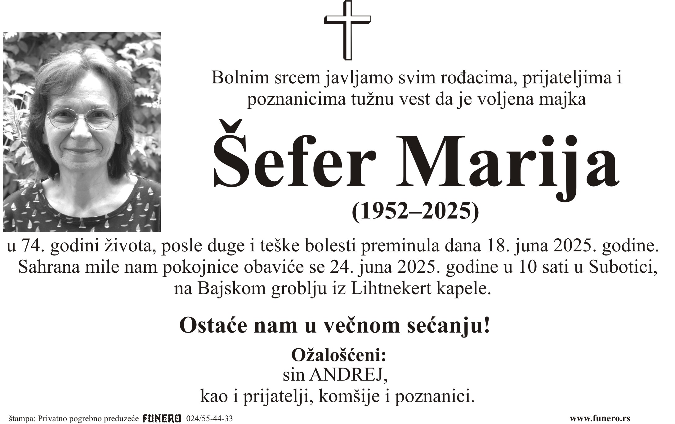 U 73. godini preminula je Marija Šefer iz Subotice, iz ulice Žarka Zrenjanina. Sahrana je 24. juna u 10 sati na Bajskom groblju iz Lihtnekert kapele.