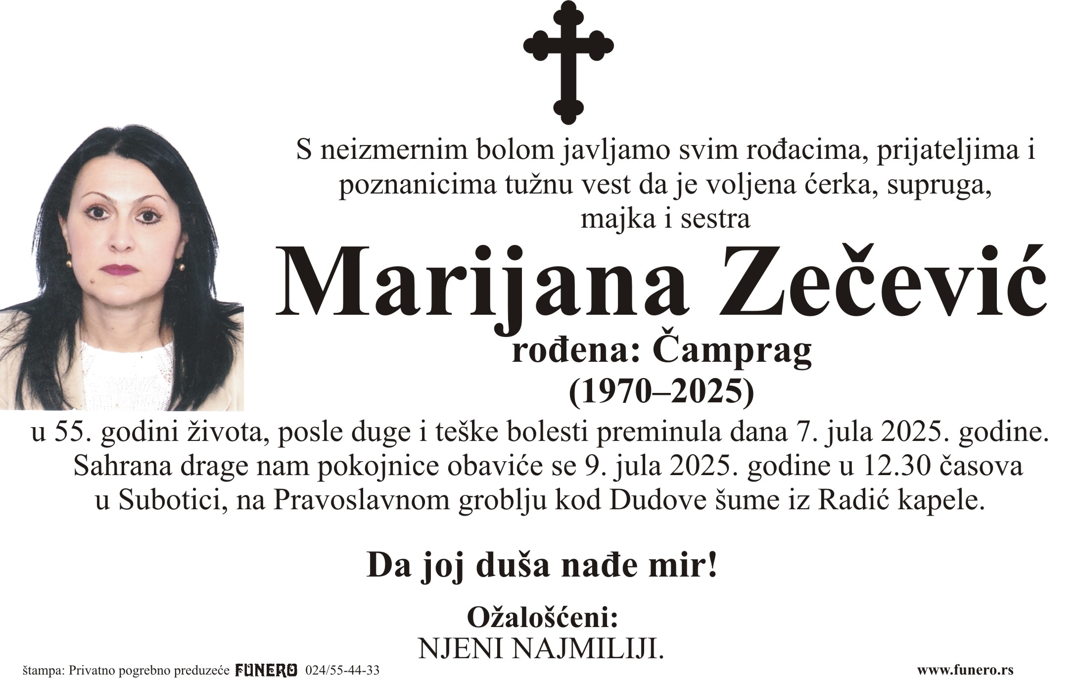 U 55. godini preminula je Marijana Zečević iz Subotice, iz ulice Josipa Kraša. Sahrana je 9. jula u 12 časova i 30 minuta na Pravoslavnom groblju kod Dudove šume iz Radić kapele.