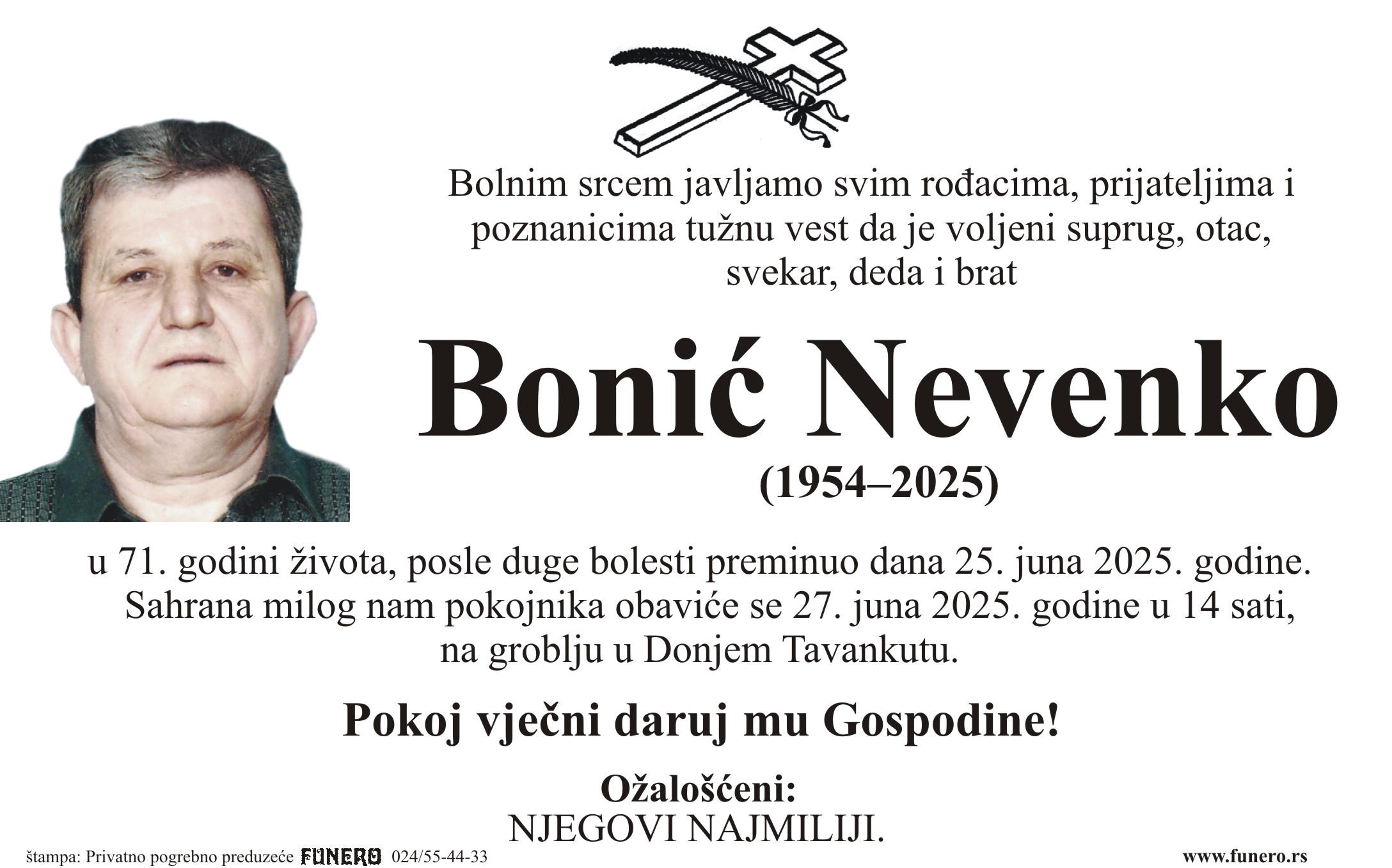 U 71. godini preminuo je Nevenko Bonić iz Donjeg Tavankuta, iz 24. Nove ulice. Sahrana je 27. juna u 14 sati na groblju u Donjem Tavankutu.
