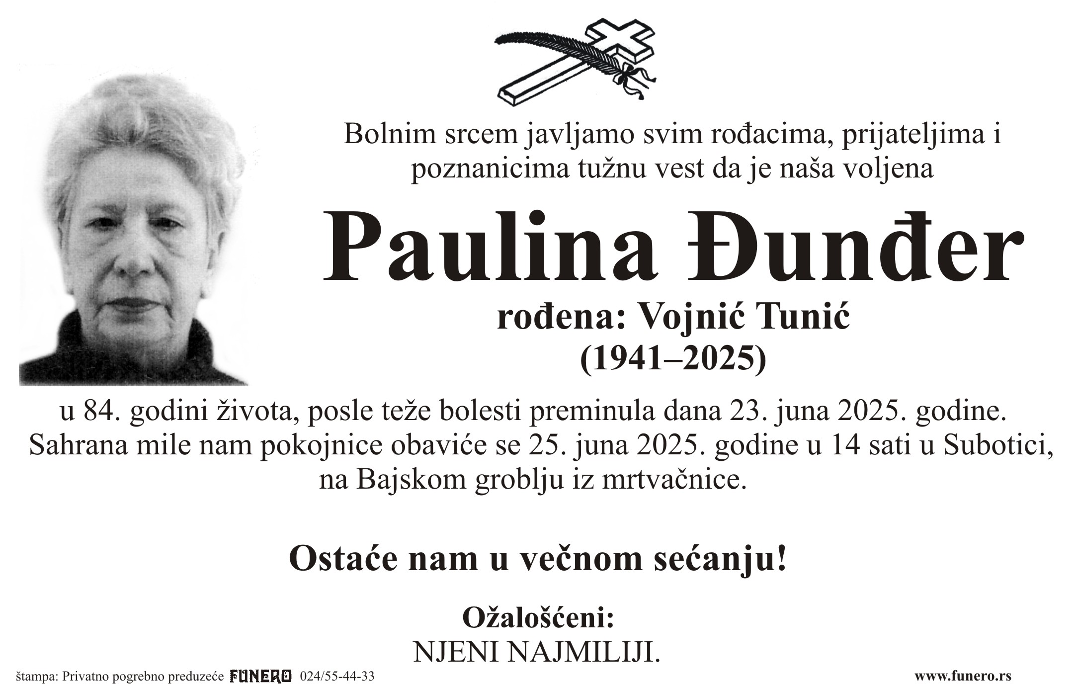 U 84. godini preminula je Paulina Đunđer iz Subotice, sa Bajskog puta. Sahrana je 25. juna u 14 sati na Bajskom groblju iz mrtvačnice.