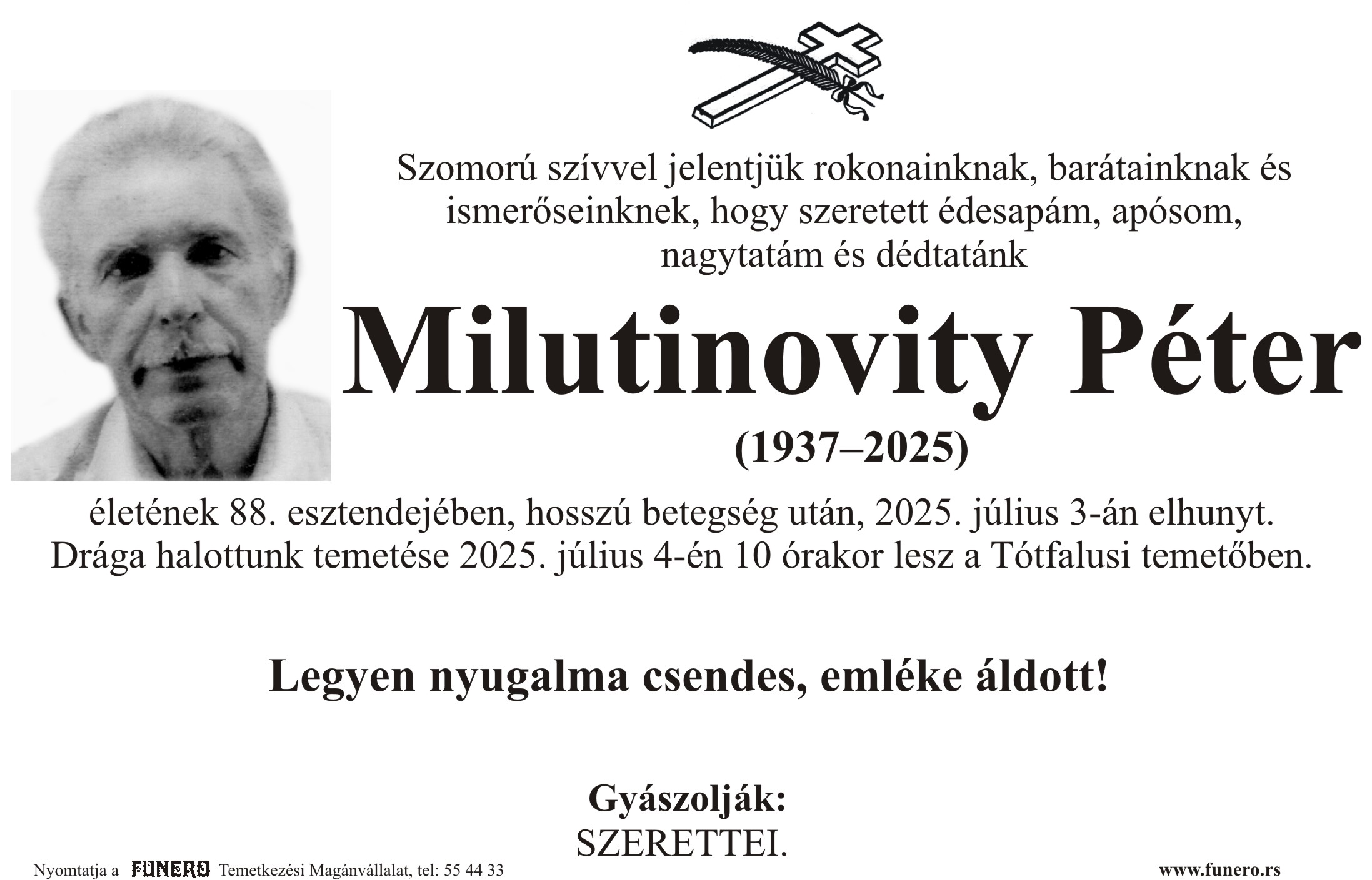 U 88. godini preminuo je Petar Milutinović iz Oroma, sa Velikog puta. Sahrana je 4. jula u 10 sati na groblju u Totovom selu.