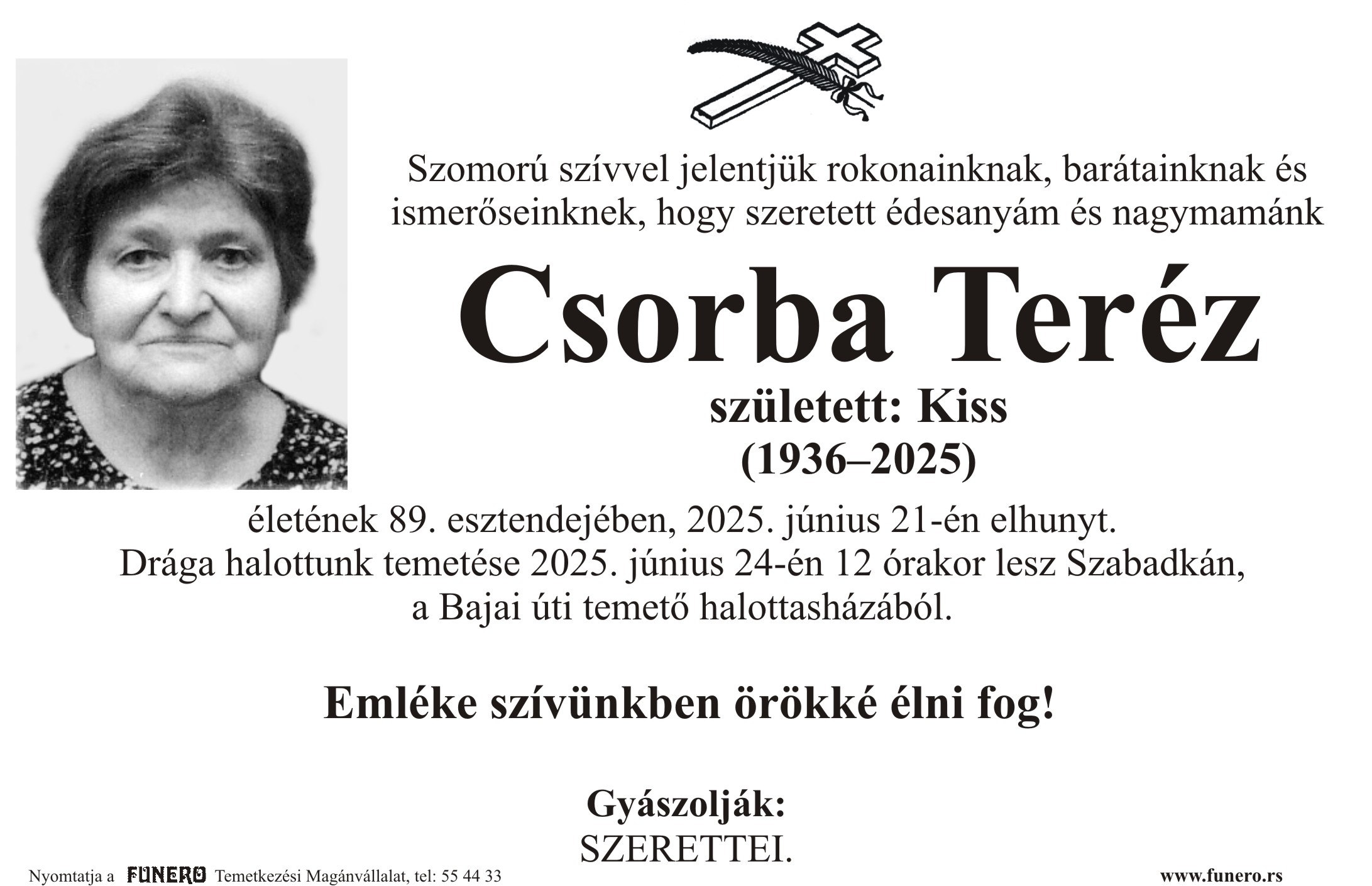 U 88. godini preminula je Terez Čorba iz Subotice, sa Karađorđevog puta. Sahrana je 24. juna u 12 sati na Bajskom groblju iz mrtvačnice.