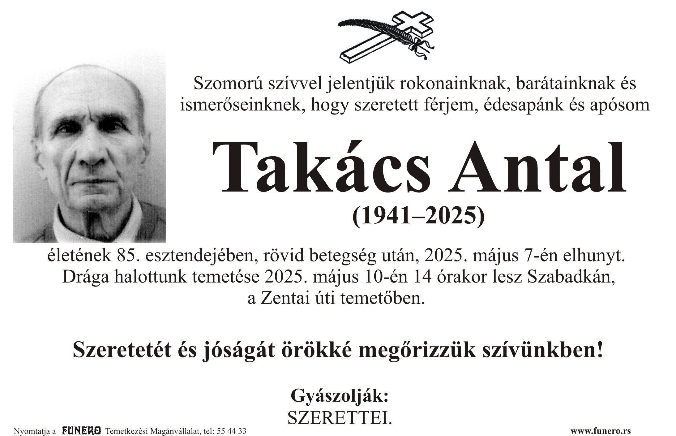 U 84. godini preminuo je Antal Takač iz Subotice. Sahrana je 10. maja u 14 sati na Senćanskom groblju.