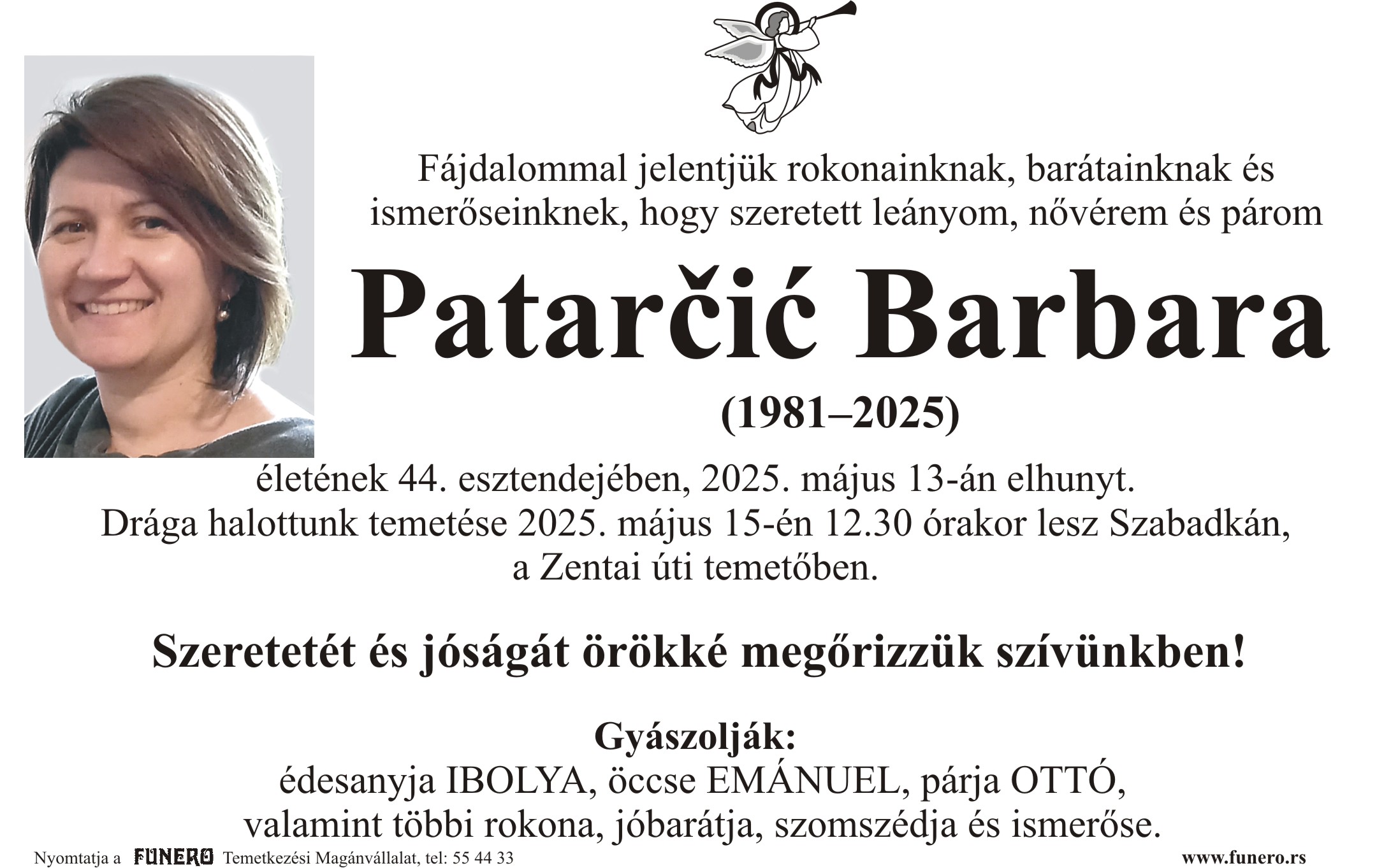 U 44. godini preminula je Barbara Patarčić iz Subotice, iz Studeničke ulice. Sahrana je 15. maja u 12 sati i 30 minuta na Senćanskom groblju.