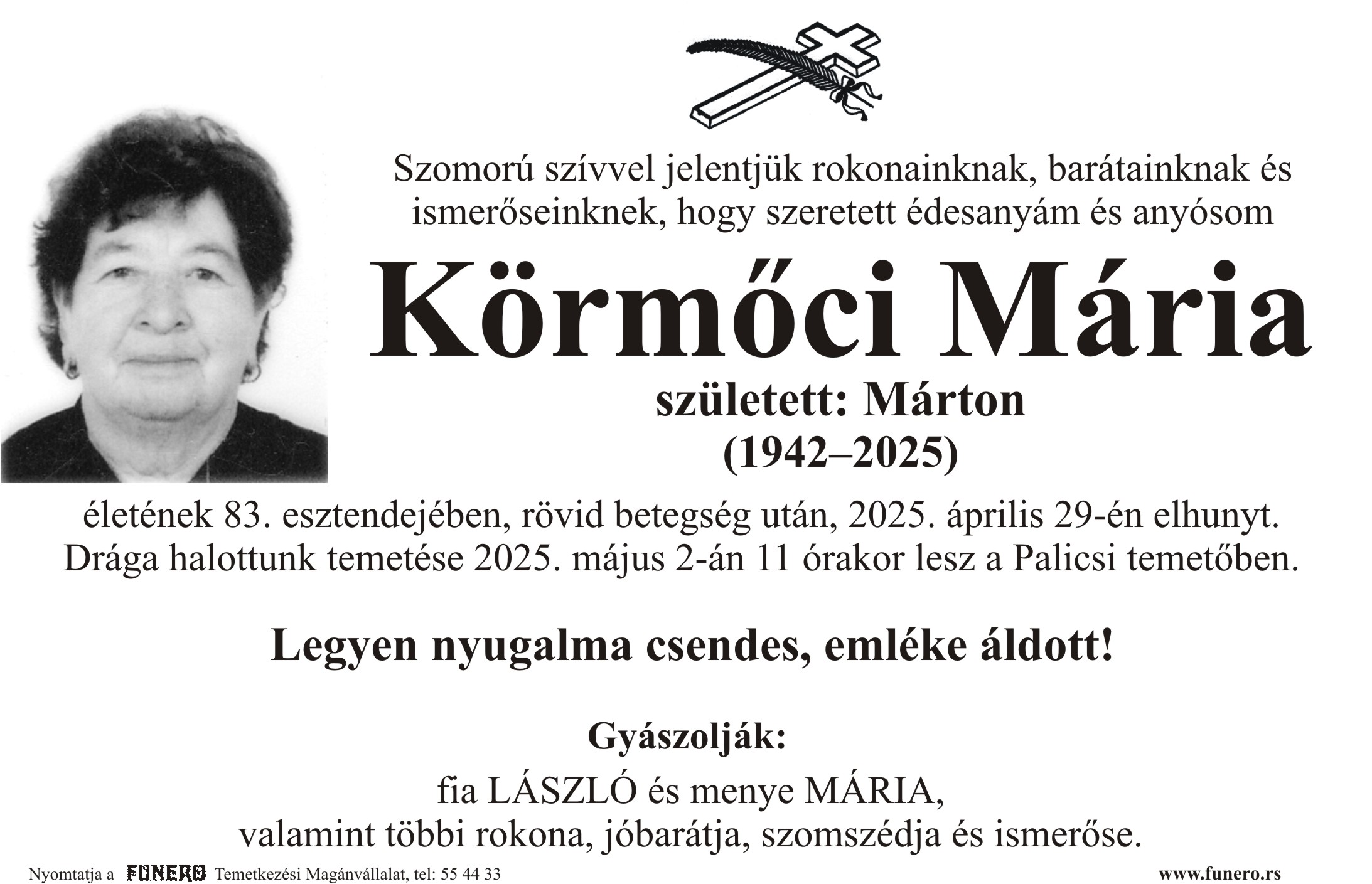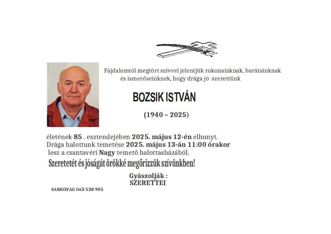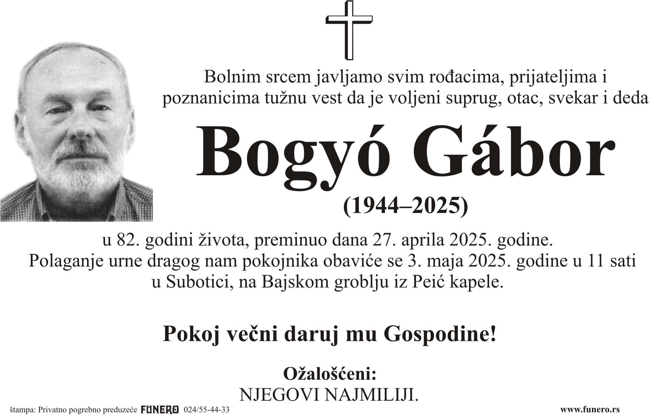 U 81. godini preminuo je Gabor Bođo iz Subotice, iz ulice Lajoša Turzoa. Polaganje urne je 3. maja u 11 sati na Bajskom groblju iz Peić kapele.