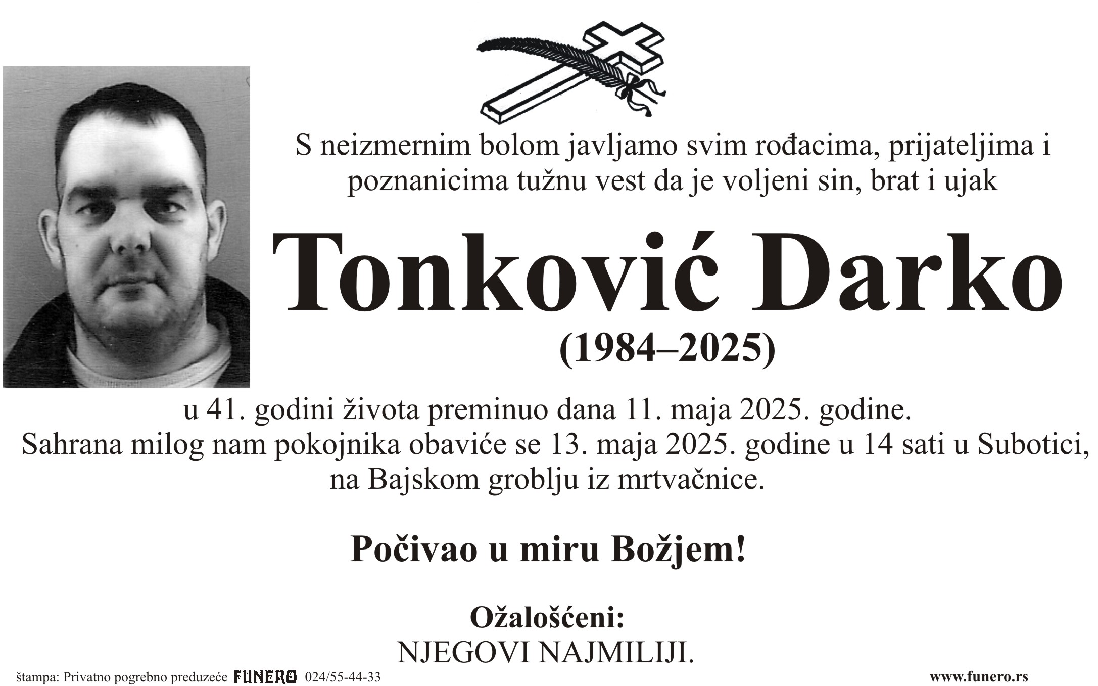 U 41. godini preminuo je Darko Tonković iz Subotice, iz ulice Nikole Demonje. Sahrana je 13. maja u 14 sati na Bajskom groblju iz mrtvačnice.