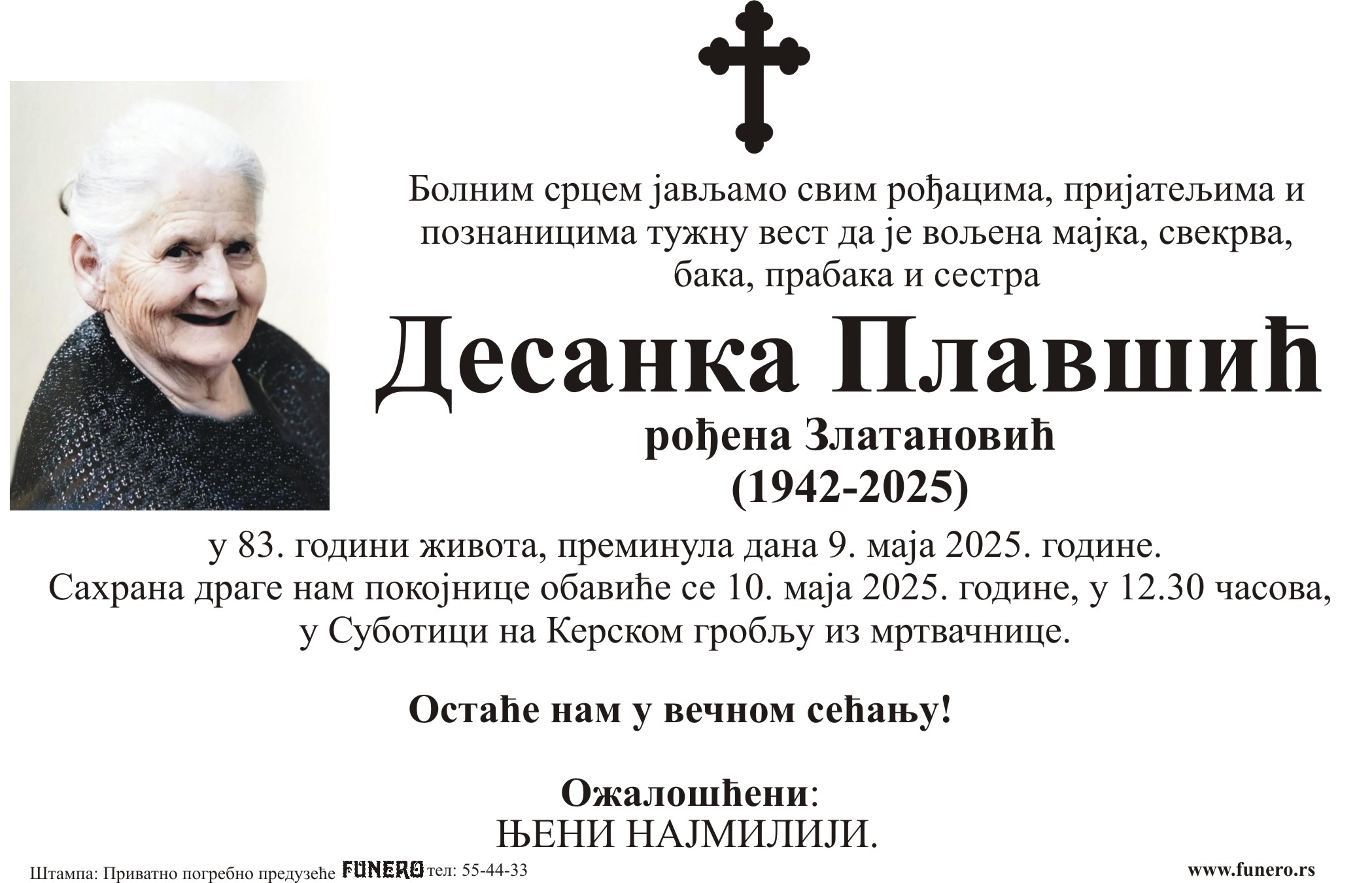 U 83. godini preminula je Desanka Plavšić iz Subotice, iz Srebreničke ulice. Sahrana je 10. maja u 12 časova i 30 minuta na Kerskom groblju iz mrtvačnice.