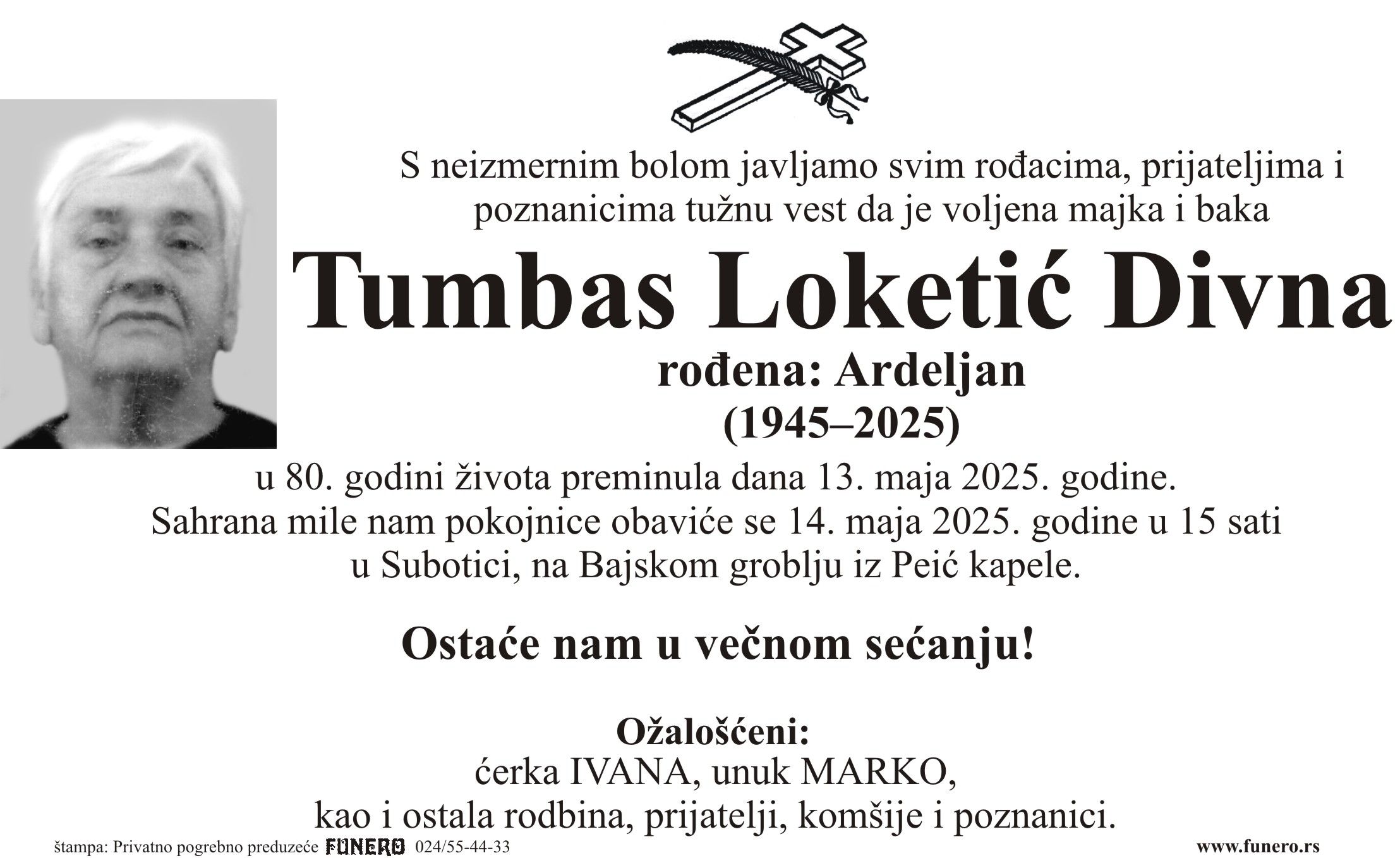 U 80. godini preminula je Divna Tumbas Loketić iz Đurđina. Sahrana je 14. maja u 15 sati na Bajskom groblju iz Peić kapele.