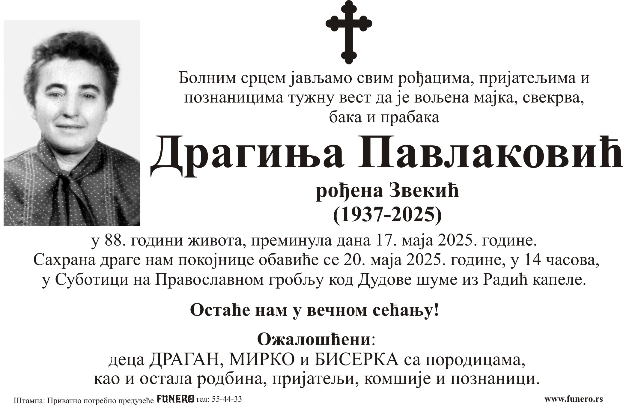 U 88. godini preminula je Draginja Pavlaković iz Kelebije, iz ulice Karolja Čeha. Sahrana je 20. maja u 14 časova na Pravoslavnom groblju kod Dudove šume iz Radić kapele.