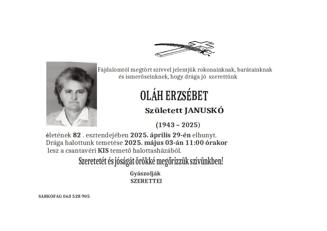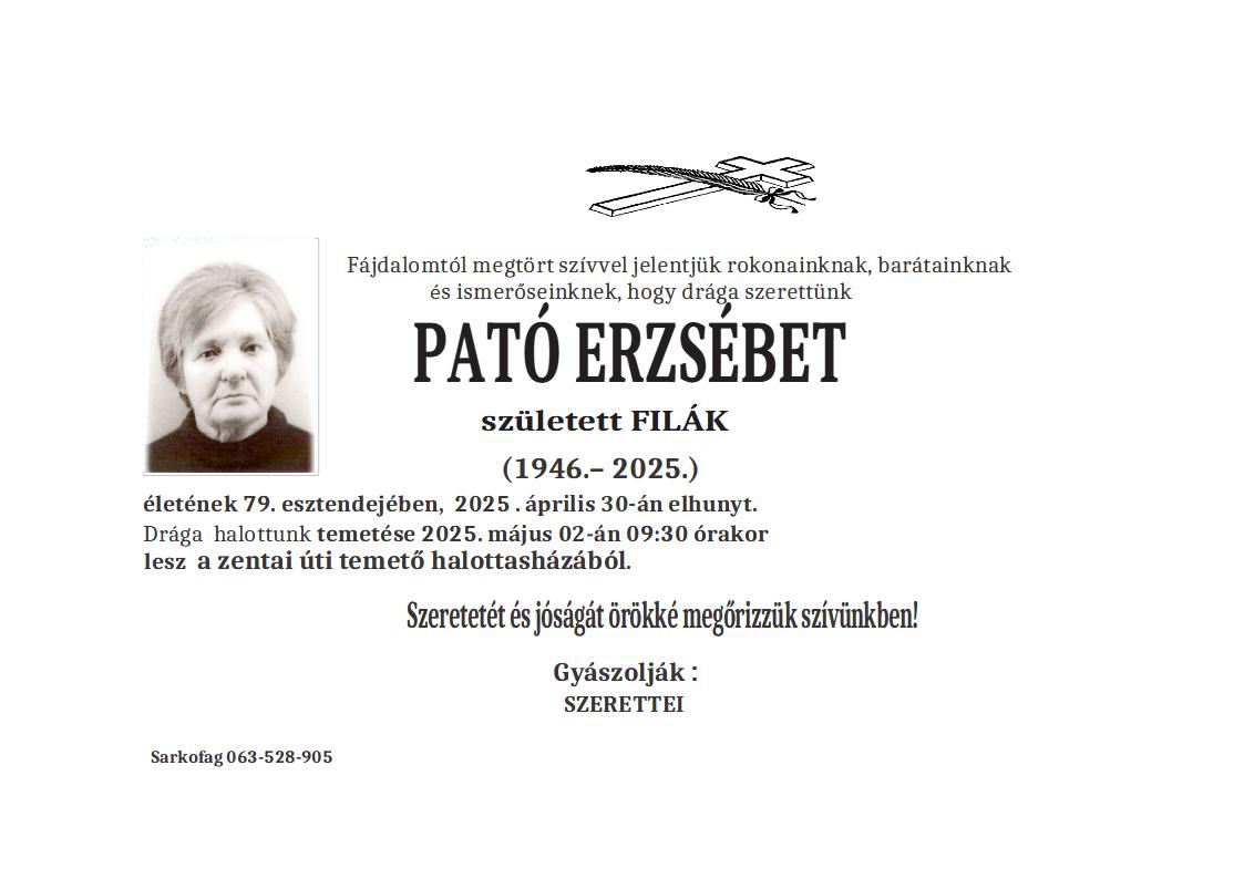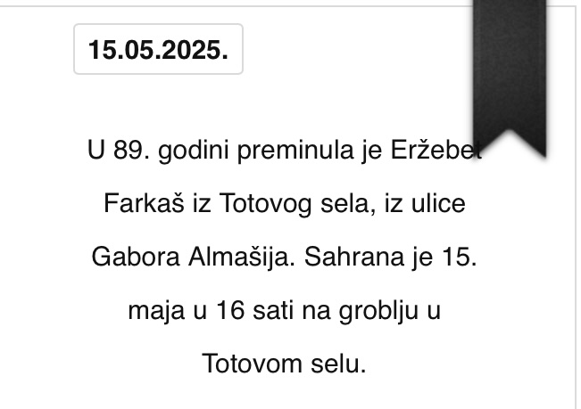 U 89. godini preminula je Eržebet Farkaš iz Totovog sela, iz ulice Gabora Almašija. Sahrana je 15. maja u 16 sati na groblju u Totovom selu.