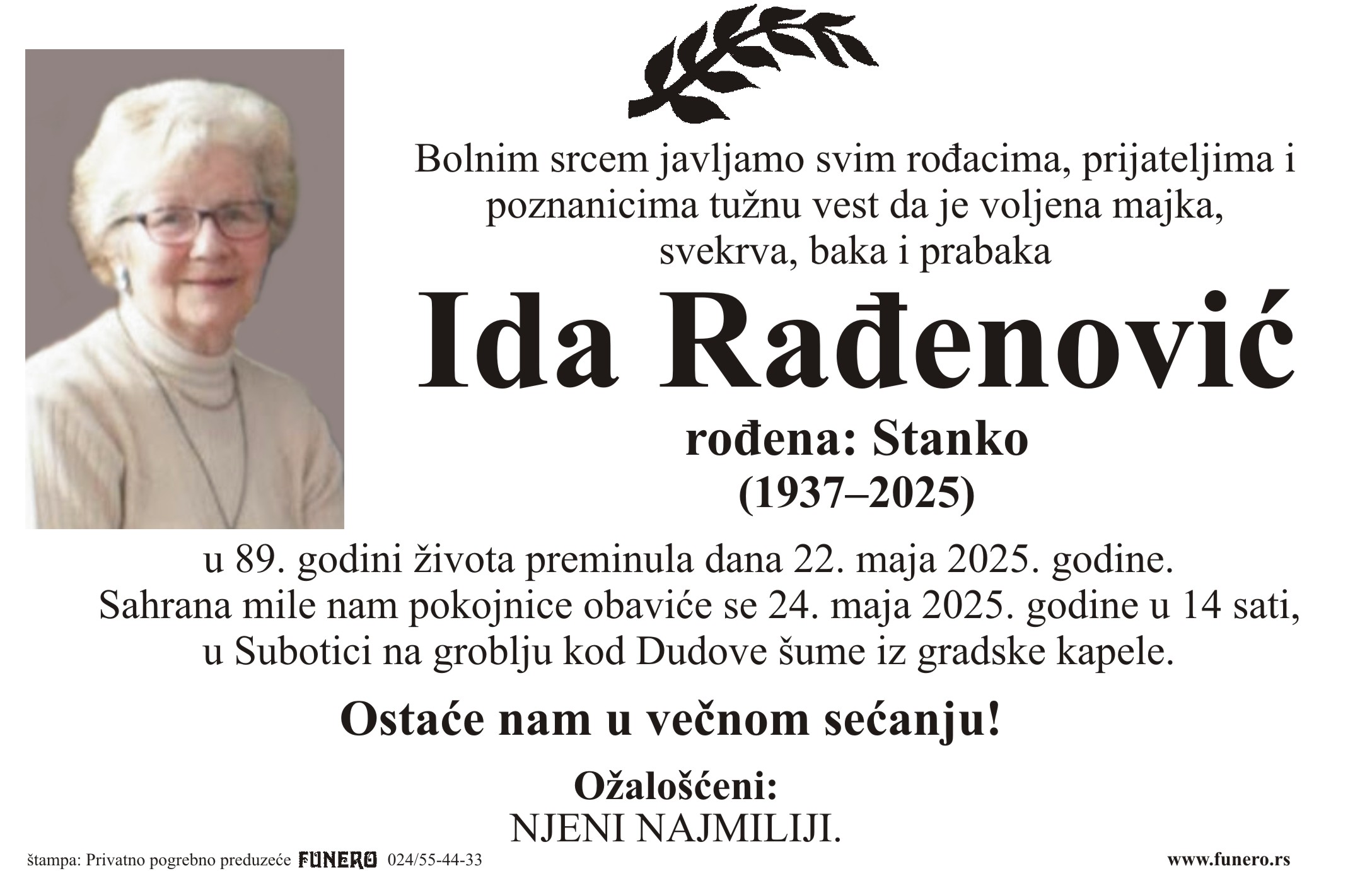 U 88. godini preminula je Ida Rađenović iz Subotice, iz ulice Adolfa Singera. Sahrana je 24. maja u 14 sati na groblju kod Dudove šume iz gradske kapele.