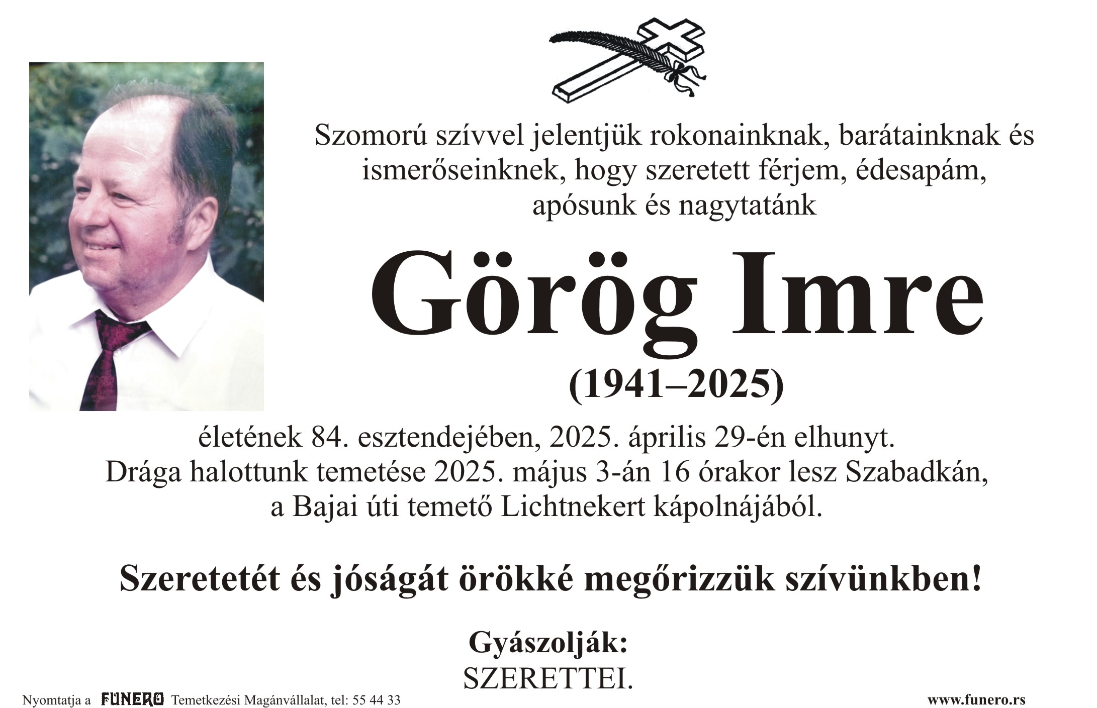 U 84. godini preminuo je Imre Gereg iz Subotice, iz ulice Jenea Kalmara. Sahrana je 3. maja u 16 sati na Bajskom groblju iz Lihtnekert kapele.