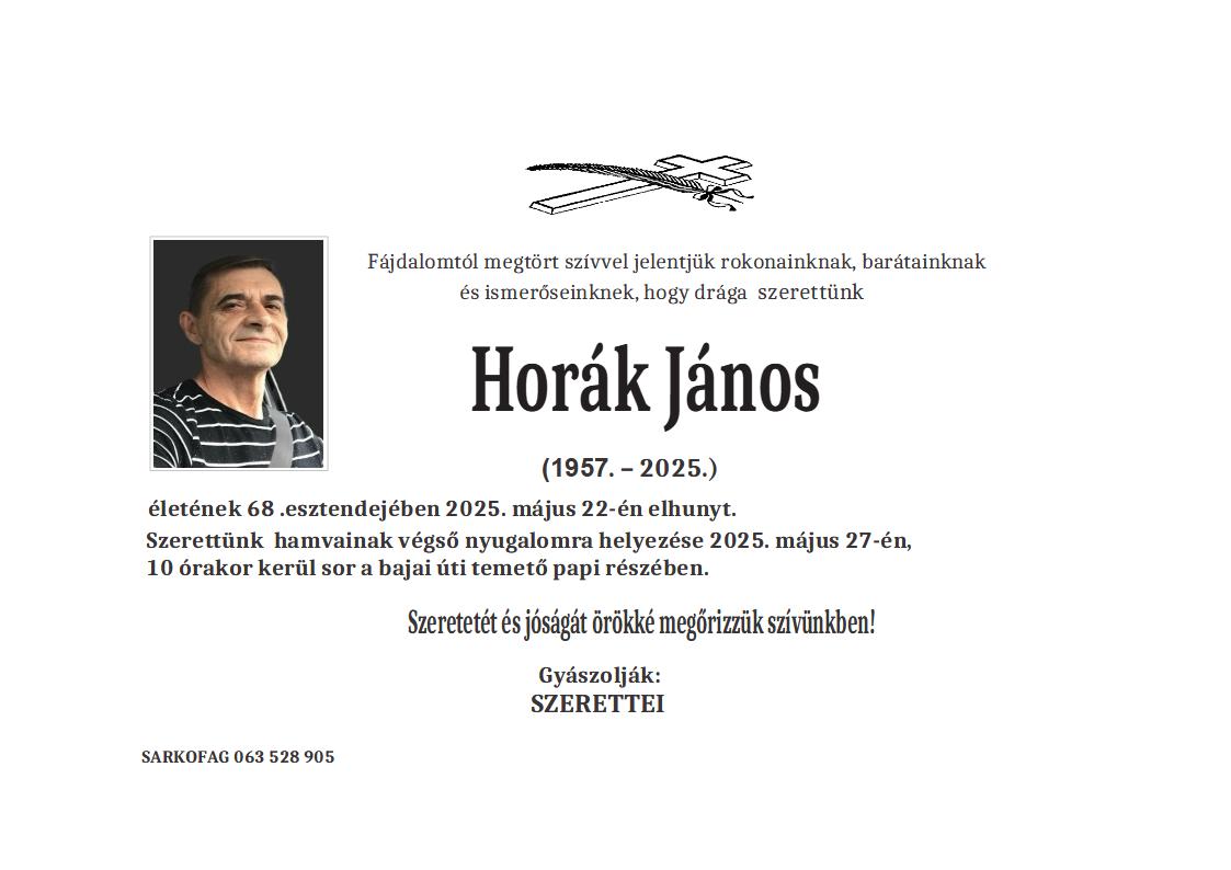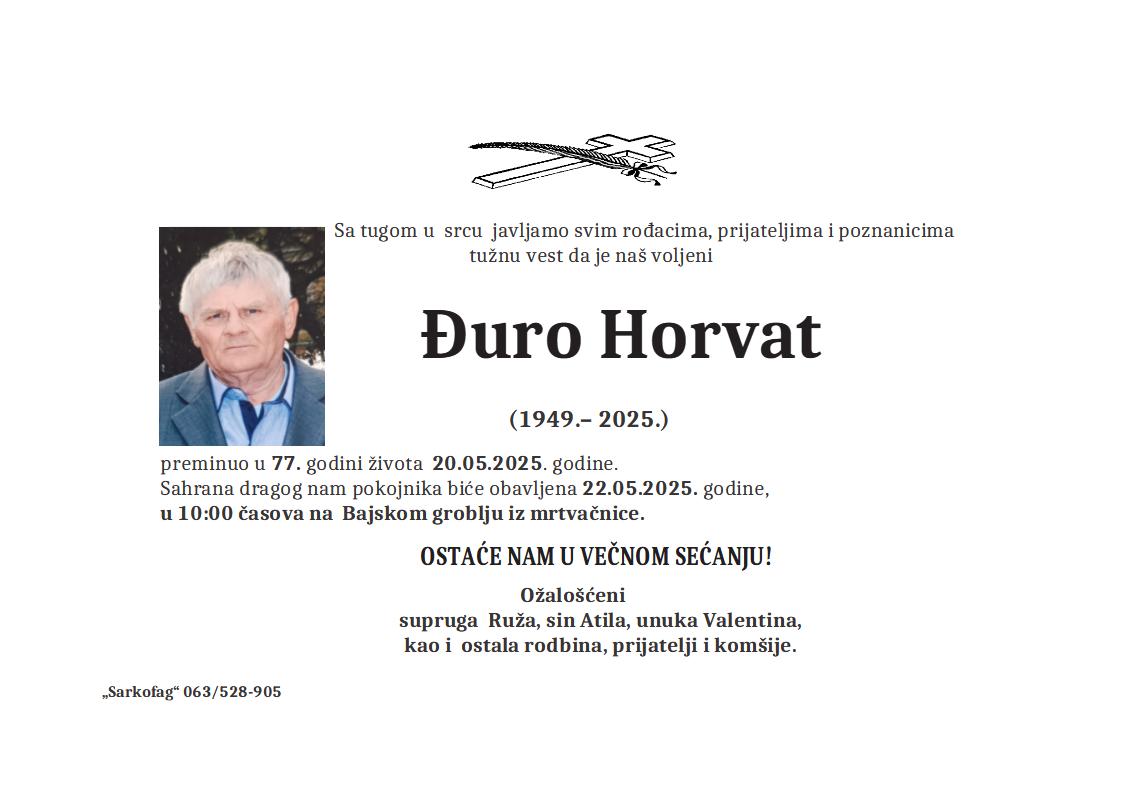 U 73. godini preminuo je Laslo Virag iz Subotice, sa Majšanskog puta. Sahrana je 6. maja u 11 sati na Bajskom groblju iz mrtvačnice.