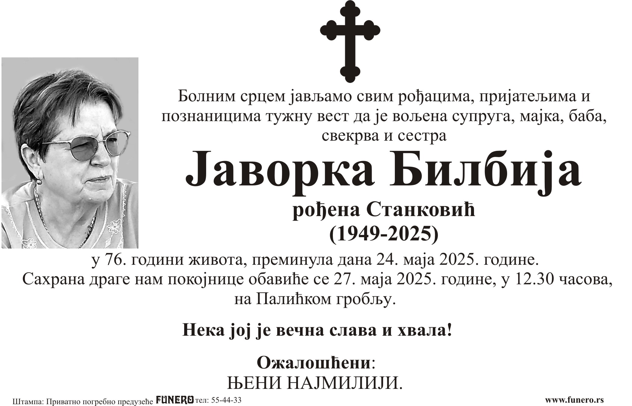 U 76. godini preminula je Javorka Bilbija sa Palića, iz Sutjeske ulice. Sahrana je 27. maja u 12 časova i 30 minuta na Palićkom groblju.