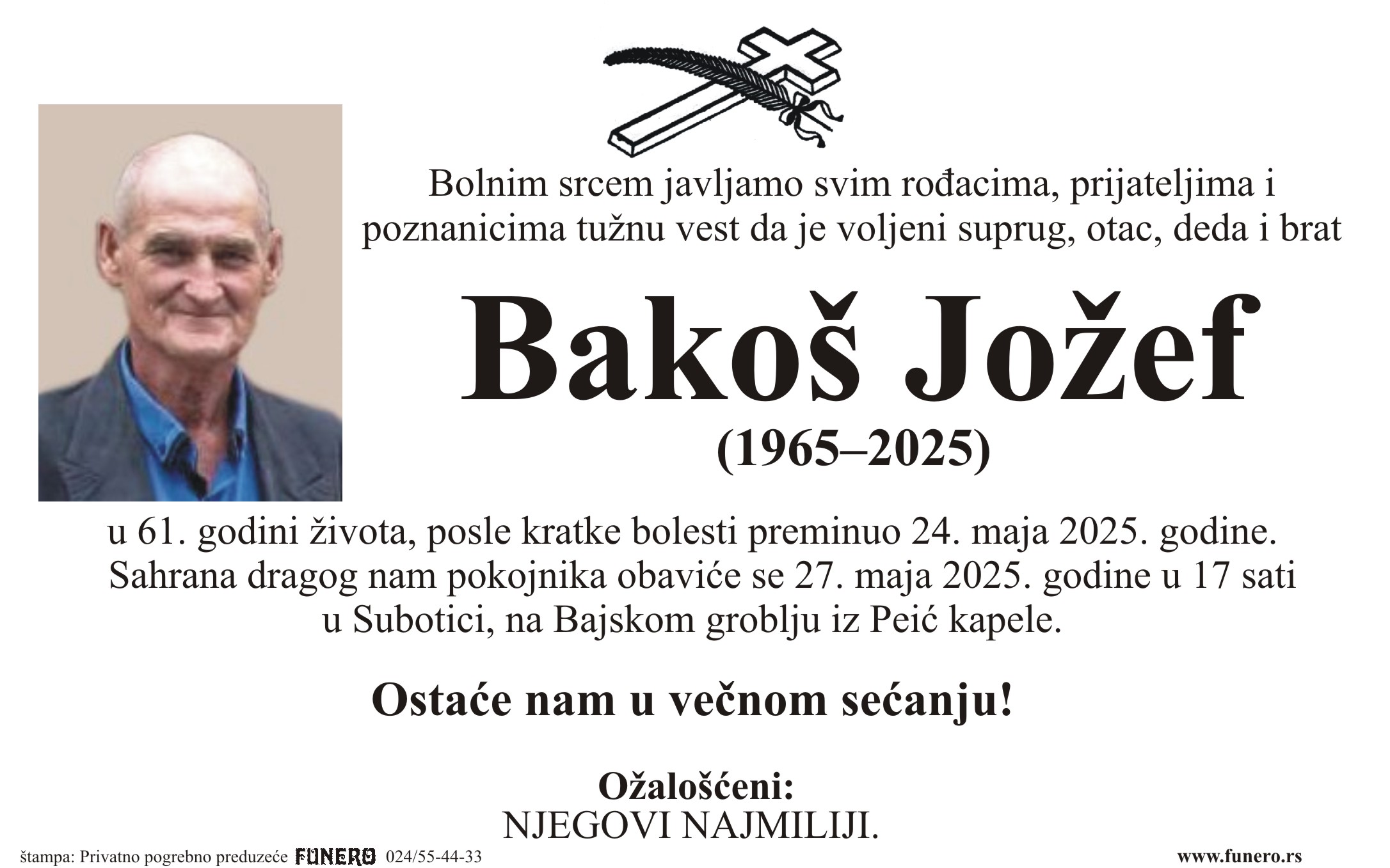 U 60. godini preminuo je Jožef Bakoš iz Subotice, iz Jasenovačke ulice. Sahrana je 27. maja u 17 sati na Bajskom groblju iz Peić kapele.
