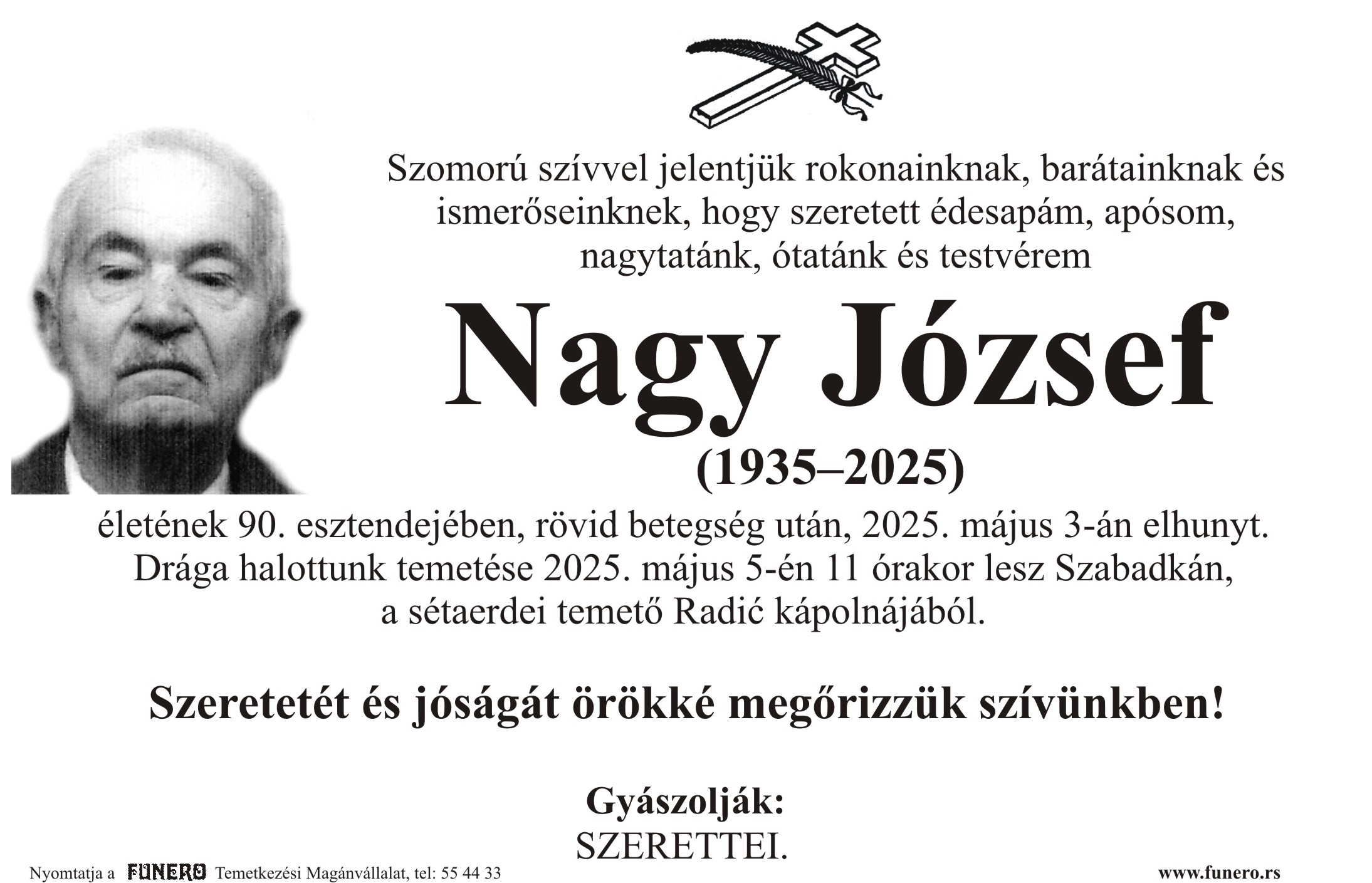 U 90. godini preminuo je Jožef Nađ iz Subotice, iz ulice 27. marta. Sahrana je 5. maja u 11 sati na groblju kod Dudove šume iz Radić kapele.