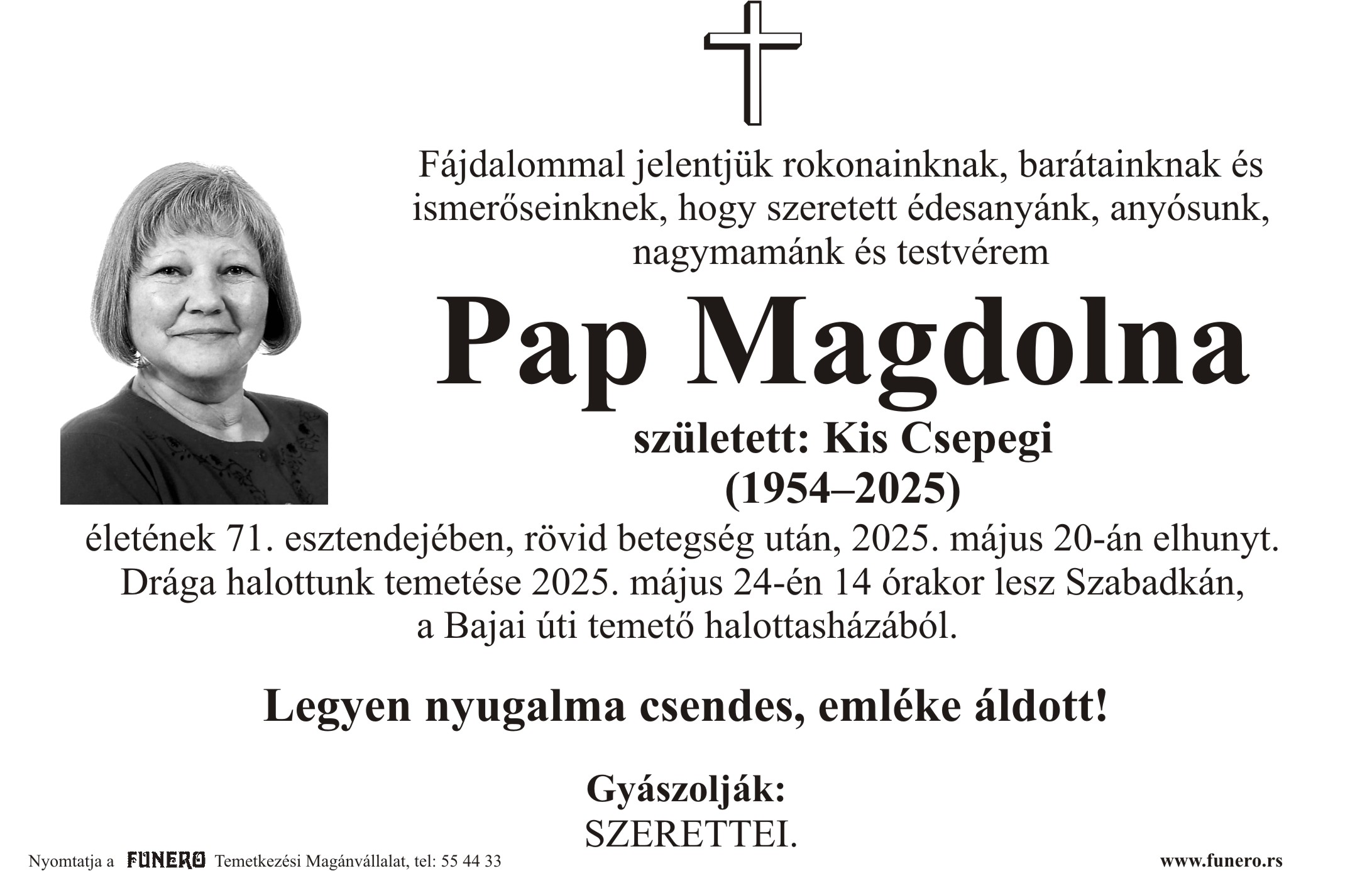U 71. godini preminula je Magdolna Pap iz Kelebije. Sahrana je 24. maja u 14 sati na Bajskom groblju iz mrtvačnice.