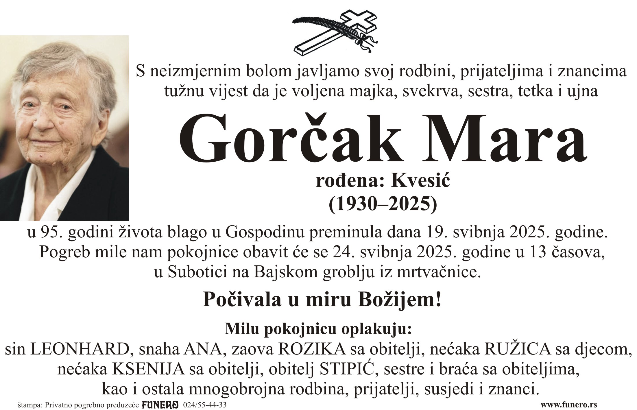 U 95. godini preminula je Mara Gorčak iz Subotice, iz Krapinske ulice. Sahrana je 24. maja u 13 sati na Bajskom groblju iz mrtvačnice.