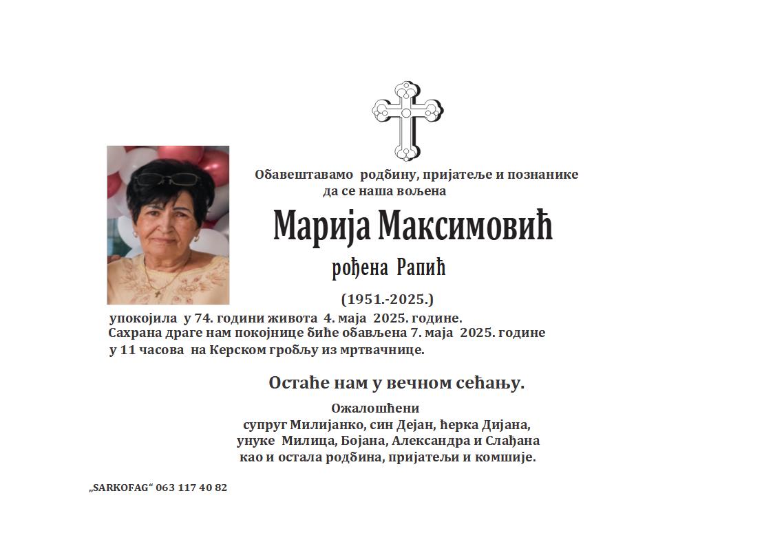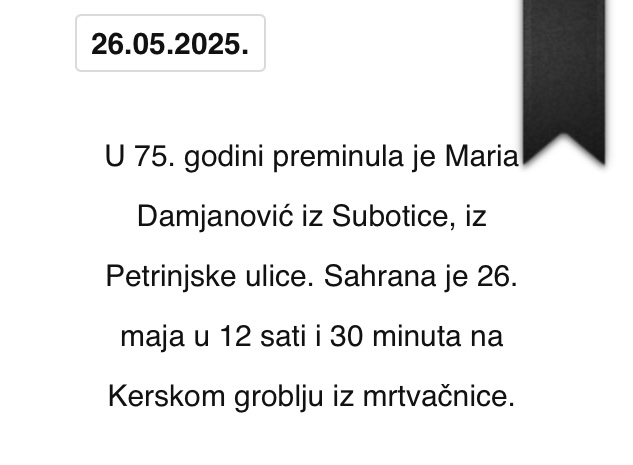 U 75. godini preminula je Maria Damjanović iz Subotice, iz Petrinjske ulice. Sahrana je 26. maja u 12 sati i 30 minuta na Kerskom groblju iz mrtvačnice.