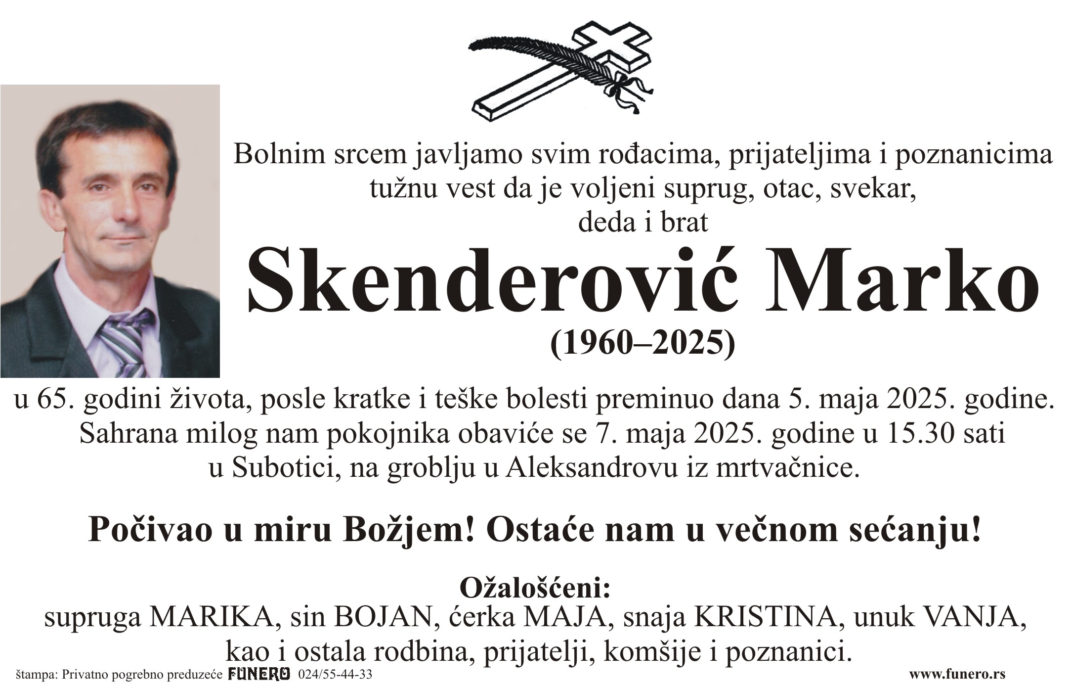U 64. godini preminuo je Marko Skenderović iz Subotice, iz ulice Aksentija Marodića. Sahrana je 7. maja u 15 sati i 30 minuta na groblju u Aleksandrovu iz mrtvačnice.