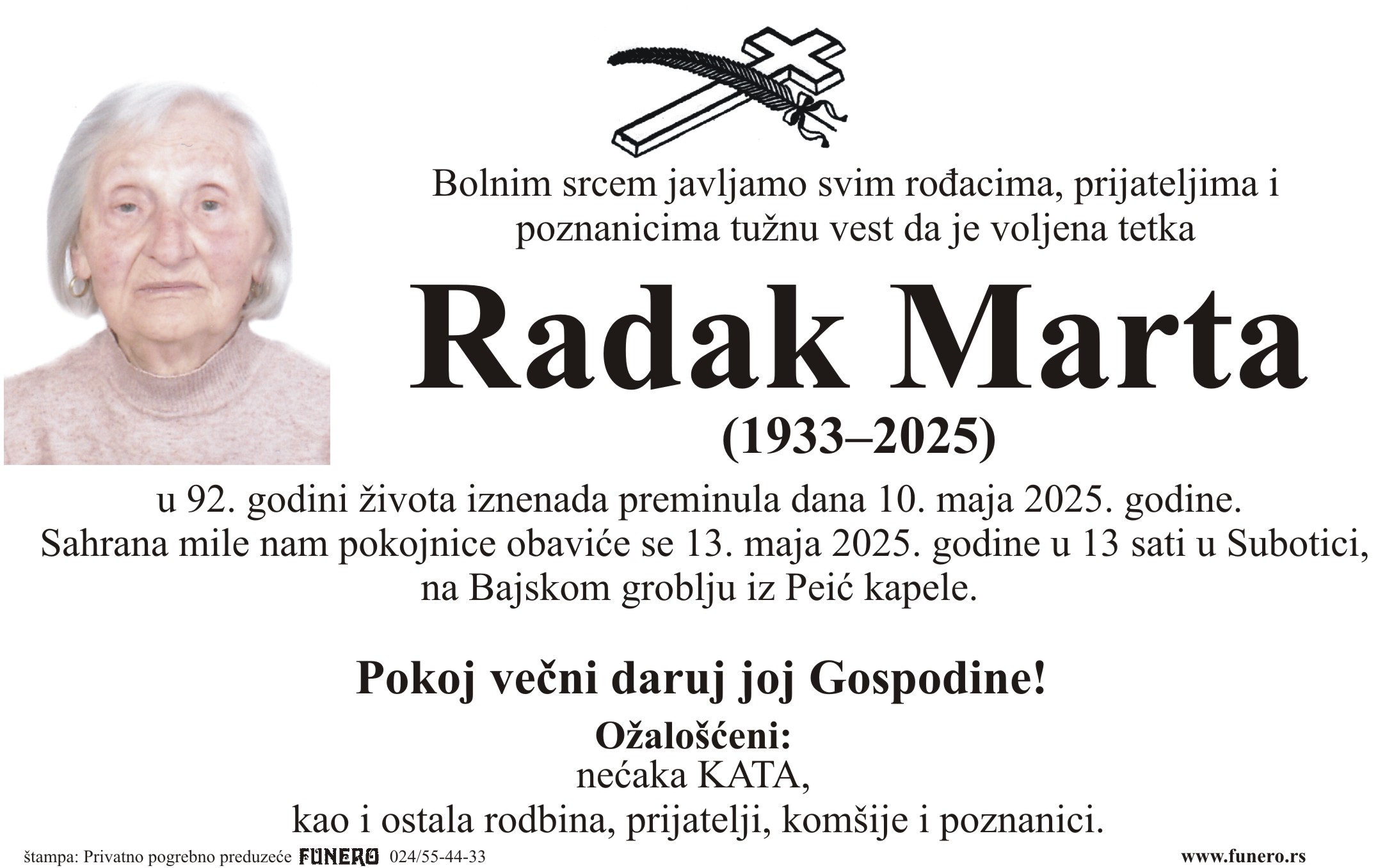 U 92. godini preminula je Marta Radak iz Subotice, iz Fočanske ulice. Sahrana je 13. maja u 13 sati na Bajskom groblju iz Peić kapele.